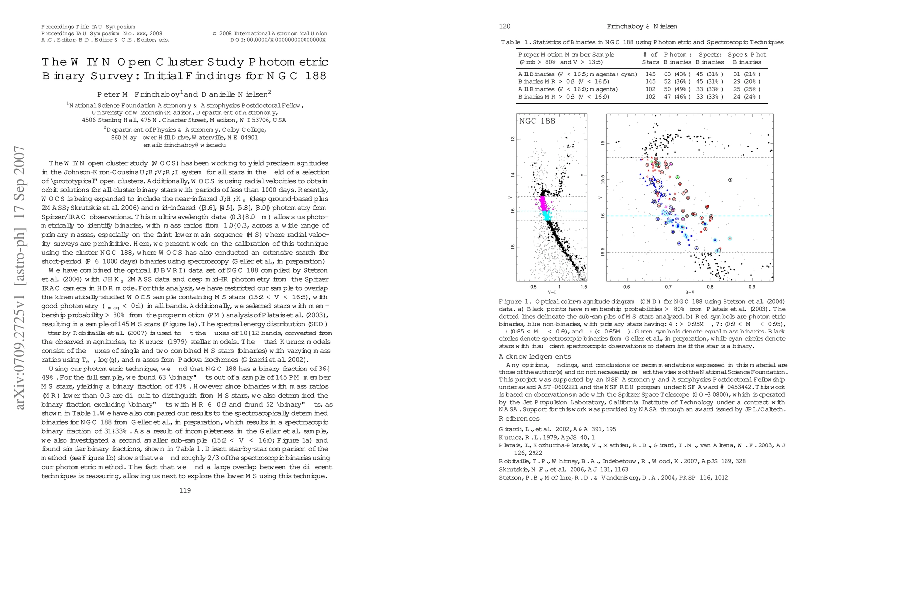 The WIYN Open Cluster Study (WOCS) has identified a binary fraction of 36--49% in NGC 188 using multi-wavelength photometric data from ground-based and Spitzer/IRAC observations, complementing radial velocity-based binary studies. This comprehensive approach allows for the identification of binaries across a wide range of primary masses.