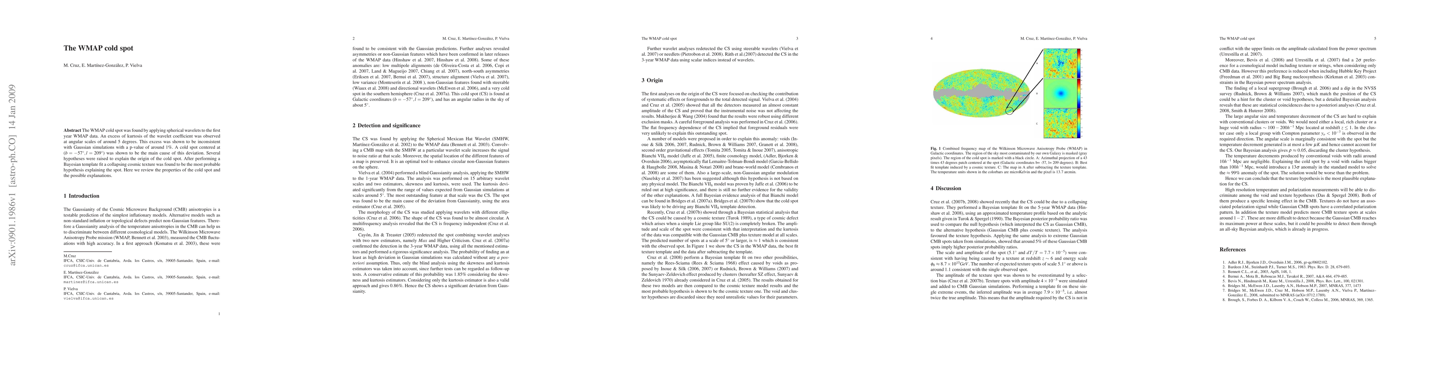 The WMAP cold spot, identified through spherical wavelet analysis of WMAP data, exhibits an unusual excess of kurtosis inconsistent with Gaussian simulations, suggesting a non-random feature. The most probable explanation for this anomaly is a collapsing cosmic texture, according to Bayesian template fitting.