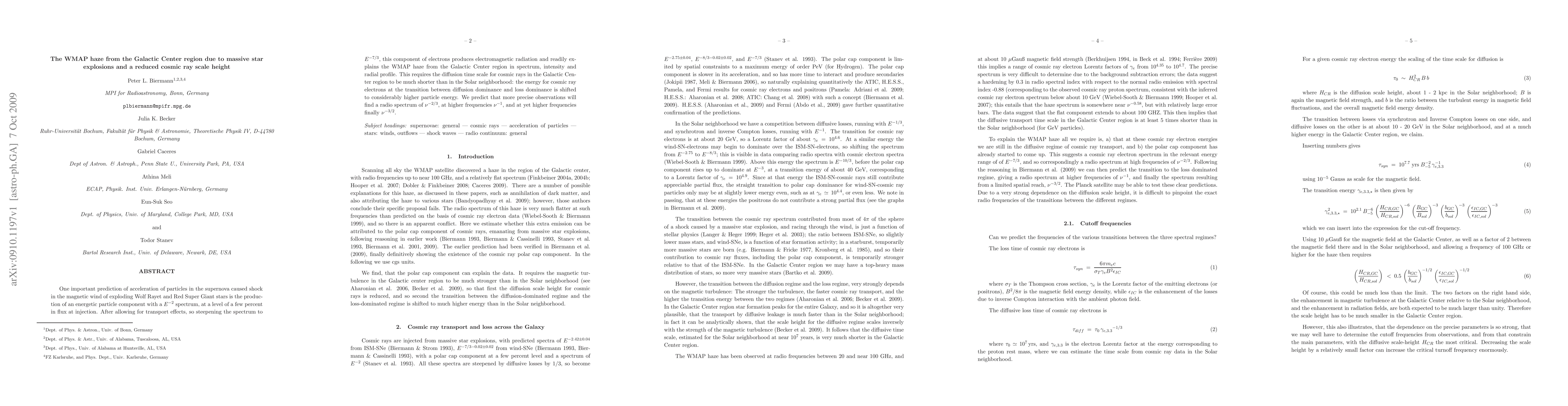 One important prediction of acceleration of particles in the supernova caused shock in the magnetic wind of exploding Wolf Rayet and Red Super Giant stars is the production of an energetic particle component with an E^-2 spectrum, at a level of a few percent in flux at injection. After allowing for transport effects, so steepening the spectrum to E^-7/3, this component of electrons produces electromagnetic radiation and readily explains the WMAP haze from the Galactic Center region in spectrum, intensity and radial profile. This requires the diffusion time scale for cosmic rays in the Galactic Center region to be much shorter than in the Solar neighborhood: the energy for cosmic ray electrons at the transition between diffusion dominance and loss dominance is shifted to considerably higher particle energy. We predict that more precise observations will find a radio spectrum of \nu^-2/3, at higher frequencies \nu^-1, and at yet higher frequencies finally \nu^-3/2.