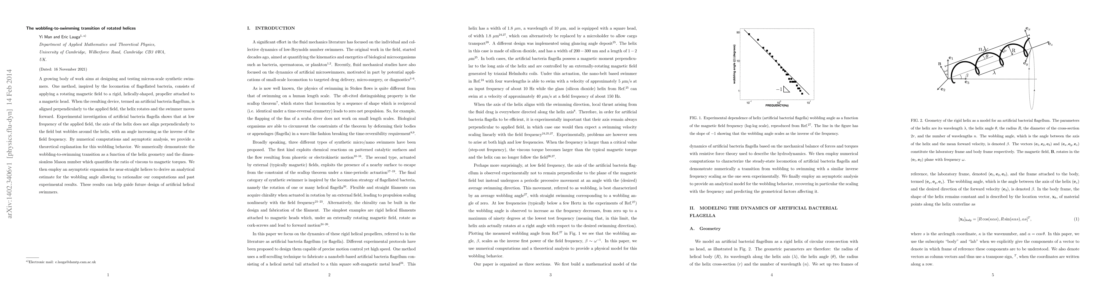 A growing body of work aims at designing and testing micron-scale synthetic swimmers. One method, inspired by the locomotion of flagellated bacteria, consists of applying a rotating magnetic field to a rigid, helically-shaped, propeller attached to a magnetic head. When the resulting device, termed an artificial bacteria flagellum, is aligned perpendicularly to the applied field, the helix rotates and the swimmer moves forward. Experimental investigation of artificial bacteria flagella shows that at low frequency of the applied field, the axis of the helix does not align perpendicularly to the field but wobbles around the helix, with an angle increasing as the inverse of the field frequency. By numerical computations and asymptotic analysis, we provide a theoretical explanation for this wobbling behavior. We numerically demonstrate the wobbling-to-swimming transition as a function of the helix geometry and the dimensionless Mason number which quantifies the ratio of viscous to magnetic torques. We then employ an asymptotic expansion for near-straight helices to derive an analytical estimate for the wobbling angle allowing to rationalize our computations and past experimental results. These results can help guide future design of artificial helical swimmers.