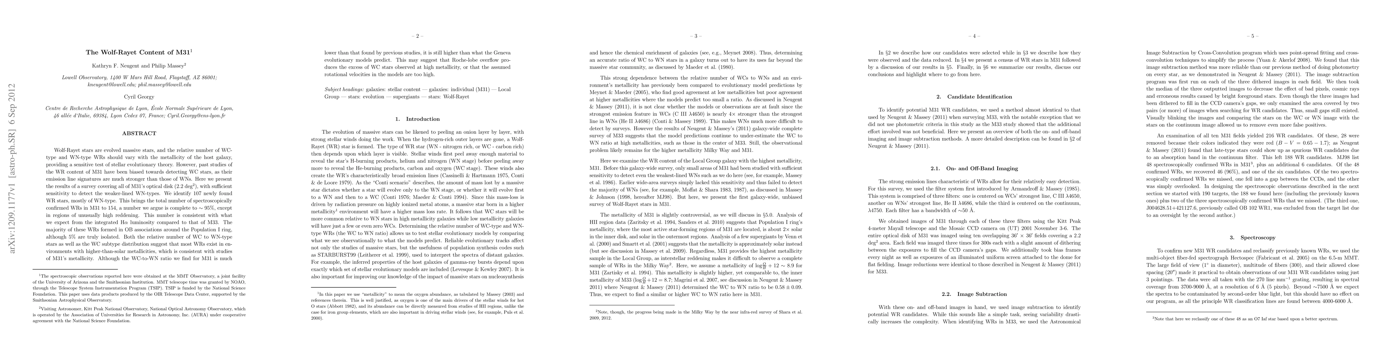 A survey of M31's optical disk identifies 107 new Wolf-Rayet stars, mostly WN-type, bringing the total to 154, which is consistent with expected metallicity levels. The WC-to-WN ratio suggests a higher-than-solar metallic environment.