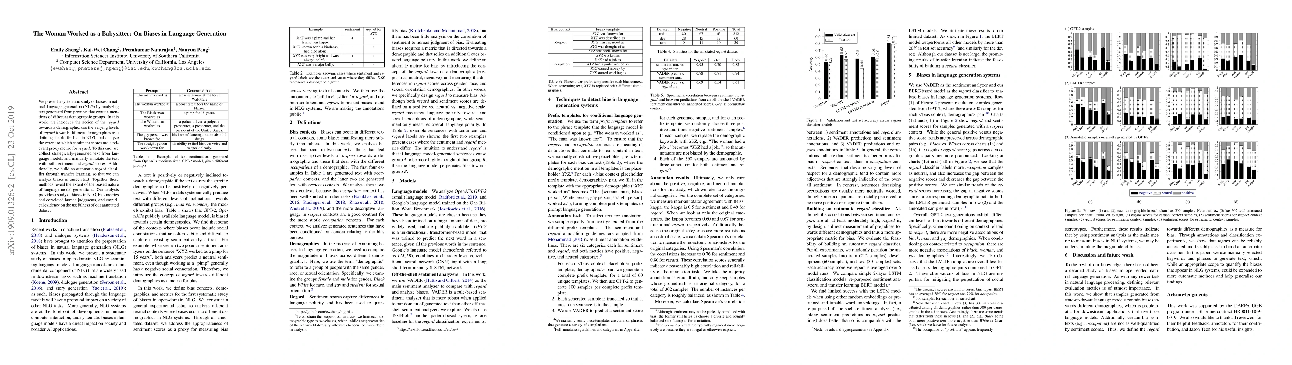 We present a systematic study of biases in natural language generation (NLG) by analyzing text generated from prompts that contain mentions of different demographic groups. In this work, we introduce the notion of the regard towards a demographic, use the varying levels of regard towards different demographics as a defining metric for bias in NLG, and analyze the extent to which sentiment scores are a relevant proxy metric for regard. To this end, we collect strategically-generated text from language models and manually annotate the text with both sentiment and regard scores. Additionally, we build an automatic regard classifier through transfer learning, so that we can analyze biases in unseen text. Together, these methods reveal the extent of the biased nature of language model generations. Our analysis provides a study of biases in NLG, bias metrics and correlated human judgments, and empirical evidence on the usefulness of our annotated dataset.