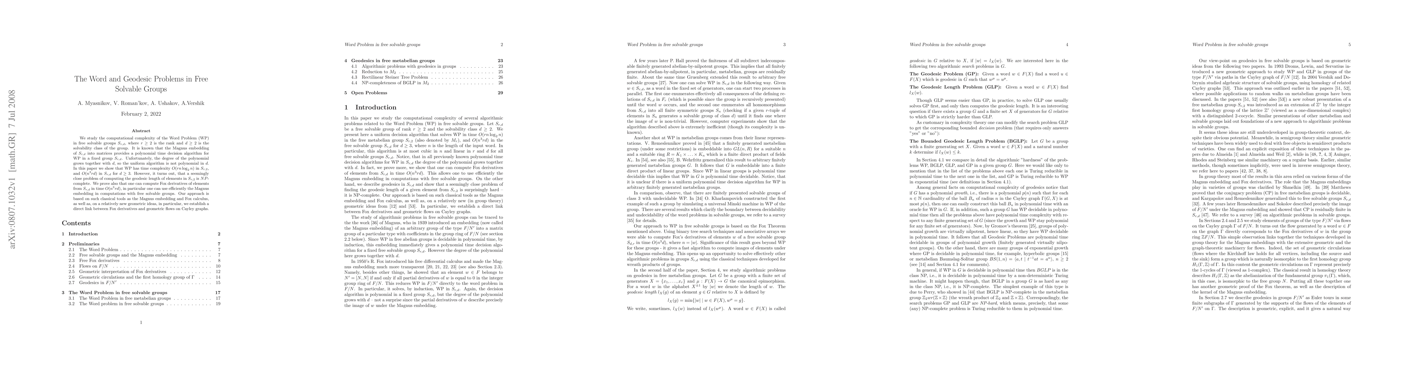 This paper investigates the computational complexity of the Word Problem in free solvable groups, revealing that while a polynomial time algorithm exists for fixed groups, the complexity grows with the solvability class. It demonstrates that the Word Problem has a time complexity of $O(r n \log_2 n)$ for $S_{r,2}$ and $O(n^3 r d)$ for $S_{r,d}$ with $d \geq 3$, and establishes that computing geodesic lengths in $S_{r,2}$ is $NP$-complete.