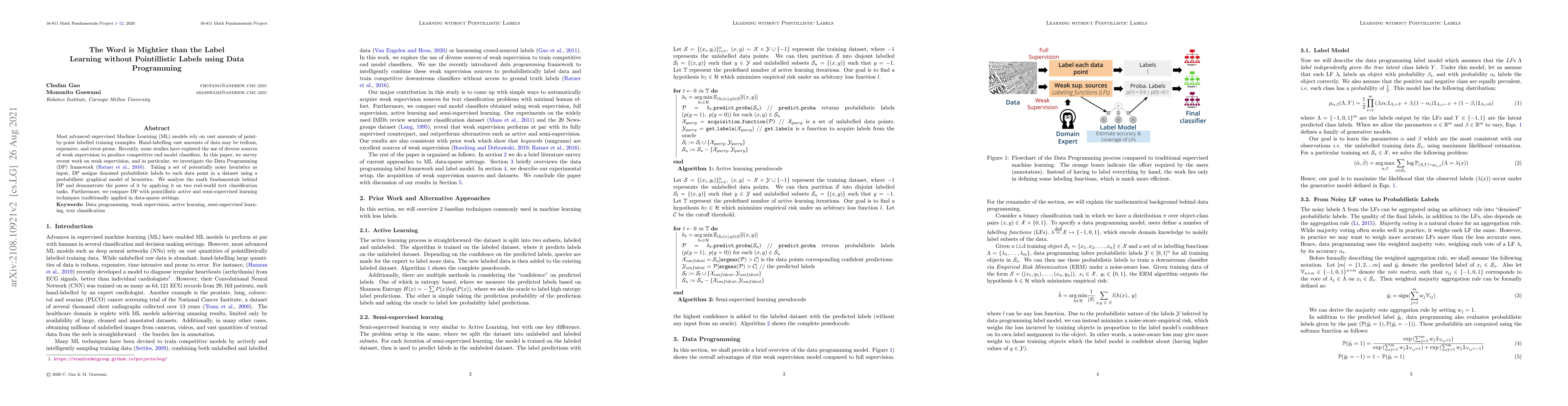 Most advanced supervised Machine Learning (ML) models rely on vast amounts of point-by-point labelled training examples. Hand-labelling vast amounts of data may be tedious, expensive, and error-prone. Recently, some studies have explored the use of diverse sources of weak supervision to produce competitive end model classifiers. In this paper, we survey recent work on weak supervision, and in particular, we investigate the Data Programming (DP) framework. Taking a set of potentially noisy heuristics as input, DP assigns denoised probabilistic labels to each data point in a dataset using a probabilistic graphical model of heuristics. We analyze the math fundamentals behind DP and demonstrate the power of it by applying it on two real-world text classification tasks. Furthermore, we compare DP with pointillistic active and semi-supervised learning techniques traditionally applied in data-sparse settings.