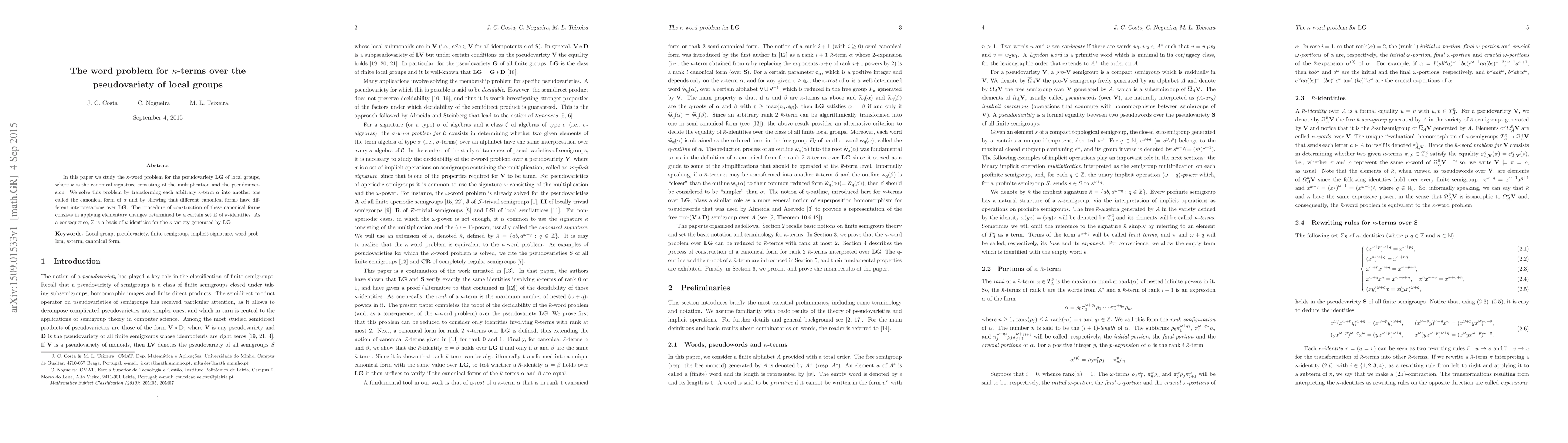 The paper solves the $ au$-word problem for local groups in a pseudovariety ${f LG}$ by transforming arbitrary terms into canonical forms using a set of identities, showing that different forms have distinct interpretations.