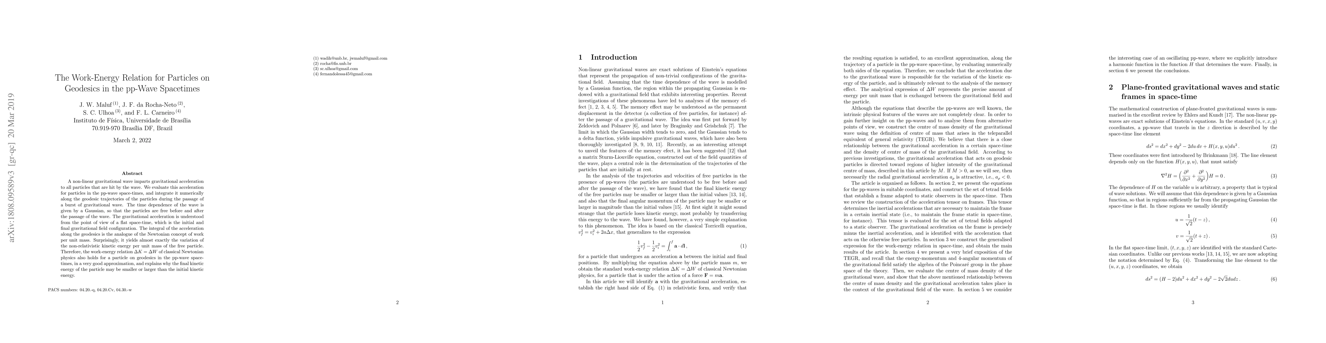A non-linear gravitational wave imparts gravitational acceleration to all particles that are hit by the wave. We evaluate this acceleration for particles in the pp-wave space-times, and integrate it numerically along the geodesic trajectories of the particles during the passage of a burst of gravitational wave. The time dependence of the wave is given by a Gaussian, so that the particles are free before and after the passage of the wave. The gravitational acceleration is understood from the point of view of a flat space-time, which is the initial and final gravitational field configuration. The integral of the acceleration along the geodesics is the analogue of the Newtonian concept of work per unit mass. Surprisingly, it yields almost exactly the variation of the non-relativistic kinetic energy per unit mass of the free particle. Therefore, the work-energy relation $\Delta K = \Delta W$ of classical Newtonian physics also holds for a particle on geodesics in the pp-wave space-times, in a very good approximation, and explains why the final kinetic energy of the particle may be smaller or larger than the initial kinetic energy.