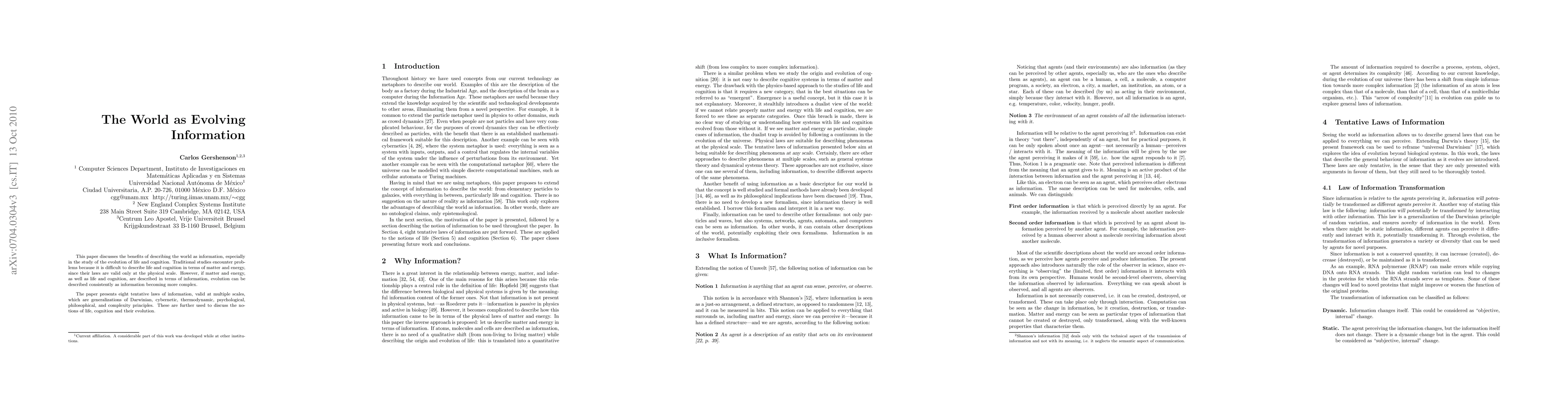 This paper discusses the benefits of describing the world as information, especially in the study of the evolution of life and cognition. Traditional studies encounter problems because it is difficult to describe life and cognition in terms of matter and energy, since their laws are valid only at the physical scale. However, if matter and energy, as well as life and cognition, are described in terms of information, evolution can be described consistently as information becoming more complex. The paper presents eight tentative laws of information, valid at multiple scales, which are generalizations of Darwinian, cybernetic, thermodynamic, psychological, philosophical, and complexity principles. These are further used to discuss the notions of life, cognition and their evolution.