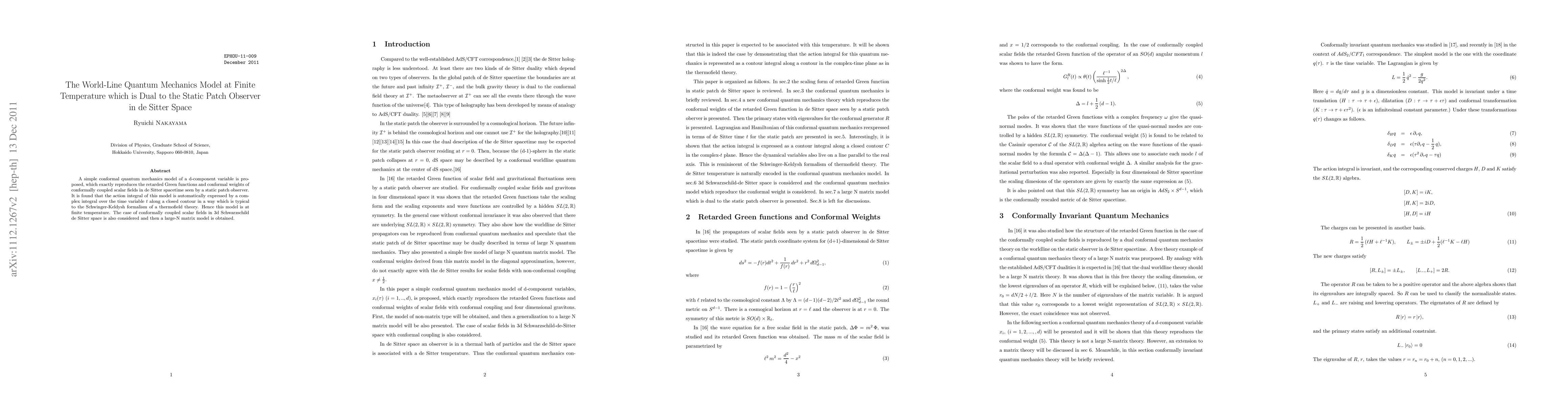 A simple conformal quantum mechanics model of a d-component variable is proposed, which exactly reproduces the retarded Green functions and conformal weights of conformally coupled scalar fields in de Sitter spacetime seen by a static patch observer. It is found that the action integral of this model is automatically expressed by a complex integral over the time variable t along a closed contour in a way which is typical to the Schwinger-Keldysh formalism of a thermofield theory. Hence this model is at finite temperature. The case of conformally coupled scalar fields in 3d Schwarzschild de Sitter space is also considered and then a large-N matrix model is obtained.