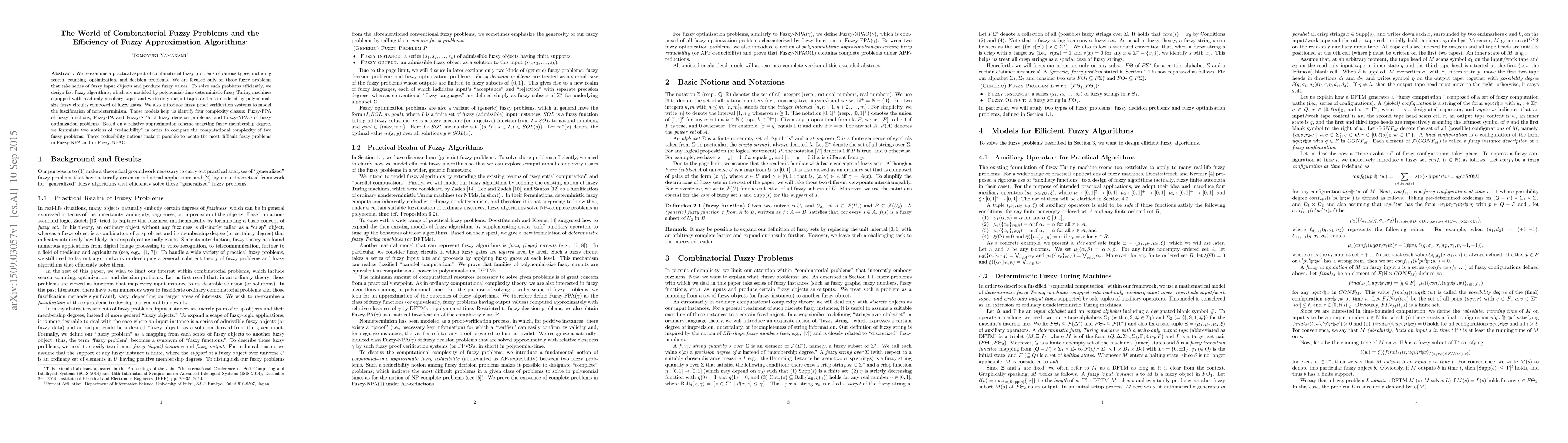 We re-examine a practical aspect of combinatorial fuzzy problems of various types, including search, counting, optimization, and decision problems. We are focused only on those fuzzy problems that take series of fuzzy input objects and produce fuzzy values. To solve such problems efficiently, we design fast fuzzy algorithms, which are modeled by polynomial-time deterministic fuzzy Turing machines equipped with read-only auxiliary tapes and write-only output tapes and also modeled by polynomial-size fuzzy circuits composed of fuzzy gates. We also introduce fuzzy proof verification systems to model the fuzzification of nondeterminism. Those models help us identify four complexity classes: Fuzzy-FPA of fuzzy functions, Fuzzy-PA and Fuzzy-NPA of fuzzy decision problems, and Fuzzy-NPAO of fuzzy optimization problems. Based on a relative approximation scheme targeting fuzzy membership degree, we formulate two notions of "reducibility" in order to compare the computational complexity of two fuzzy problems. These reducibility notions make it possible to locate the most difficult fuzzy problems in Fuzzy-NPA and in Fuzzy-NPAO.