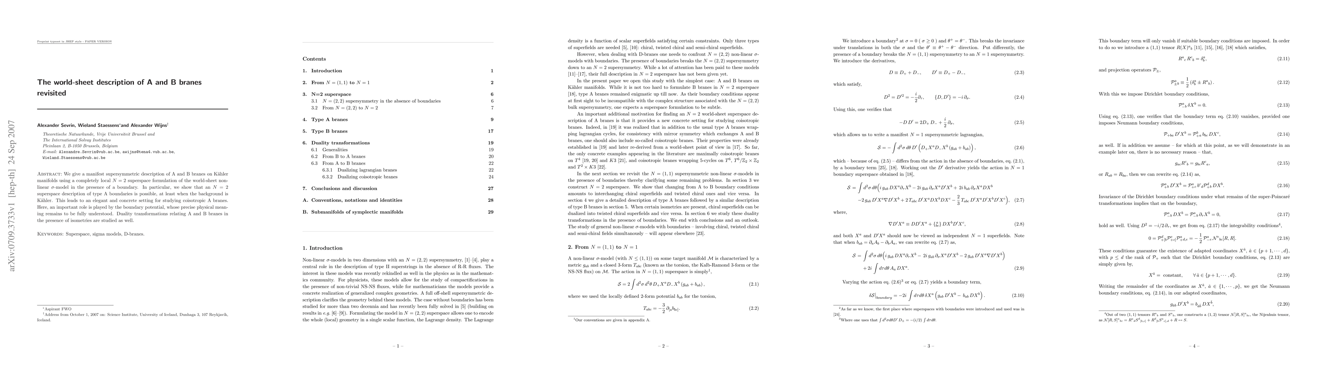 We give a manifest supersymmetric description of A and B branes on Kahler manifolds using a completely local N=2 superspace formulation of the world-sheet nonlinear sigma-model in the presence of a boundary. In particular, we show that an N=2 superspace description of type A boundaries is possible, at least when the background is Kahler. This leads to an elegant and concrete setting for studying coisotropic A branes. Here, apgesan important role is played by the boundary potential, whose precise physical meaning remains to be fully understood. Duality transformations relating A and B branes in the presence of isometries are studied as well.