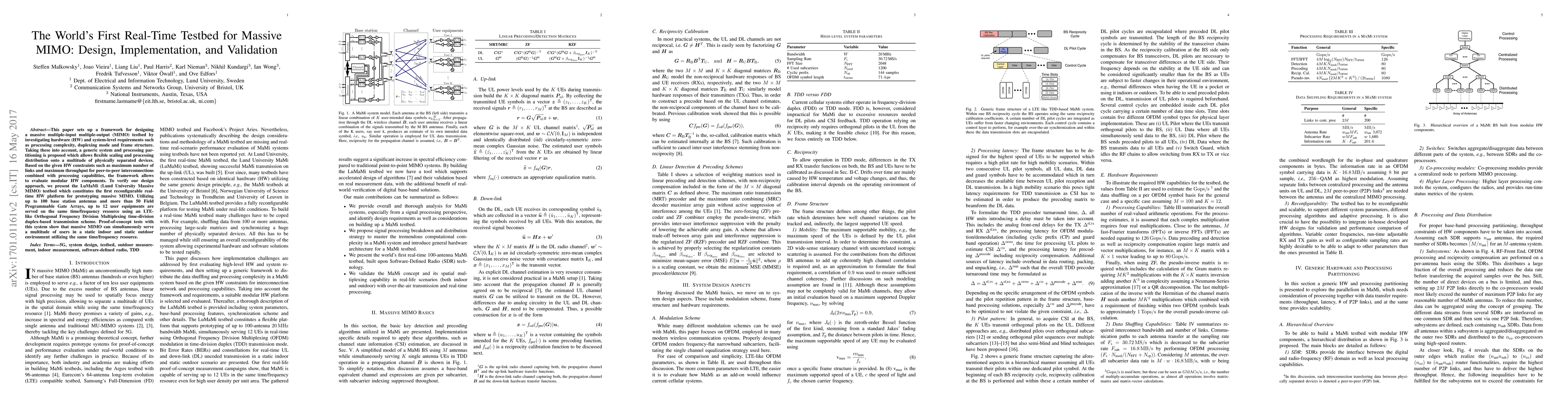 This paper designs and implements the world's first real-time testbed for massive MIMO, proposing a scalable system framework that partitions processing across multiple devices. The LuMaMi testbed, utilizing up to 100 antennas and 50 FPGAs, successfully demonstrates the simultaneous service of up to 12 users in both indoor and outdoor environments.