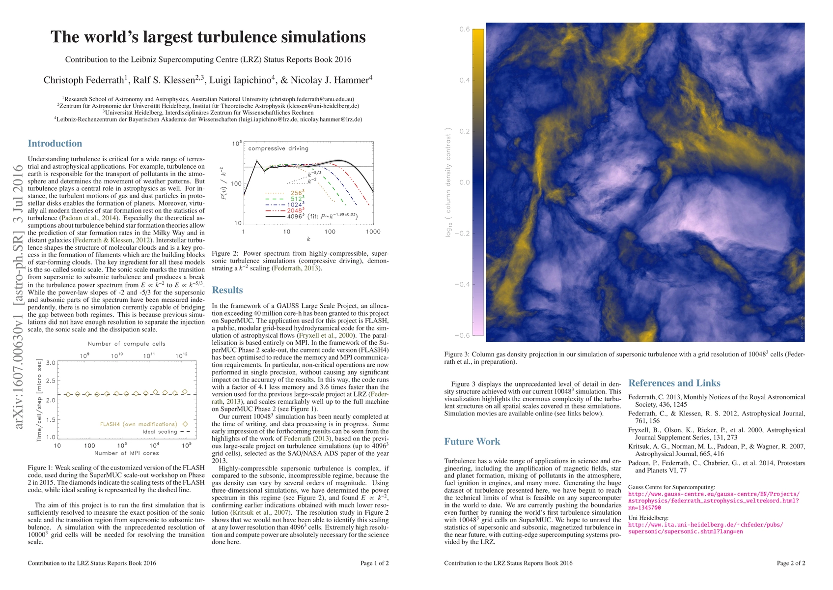 This paper reports the world's highest-resolution simulation of turbulence, achieved with 10048^3 grid points using 65536 compute cores on SuperMUC. The study presents a scaling test of the modified FLASH code and provides initial insights into the column density structure, with a detailed analysis forthcoming.