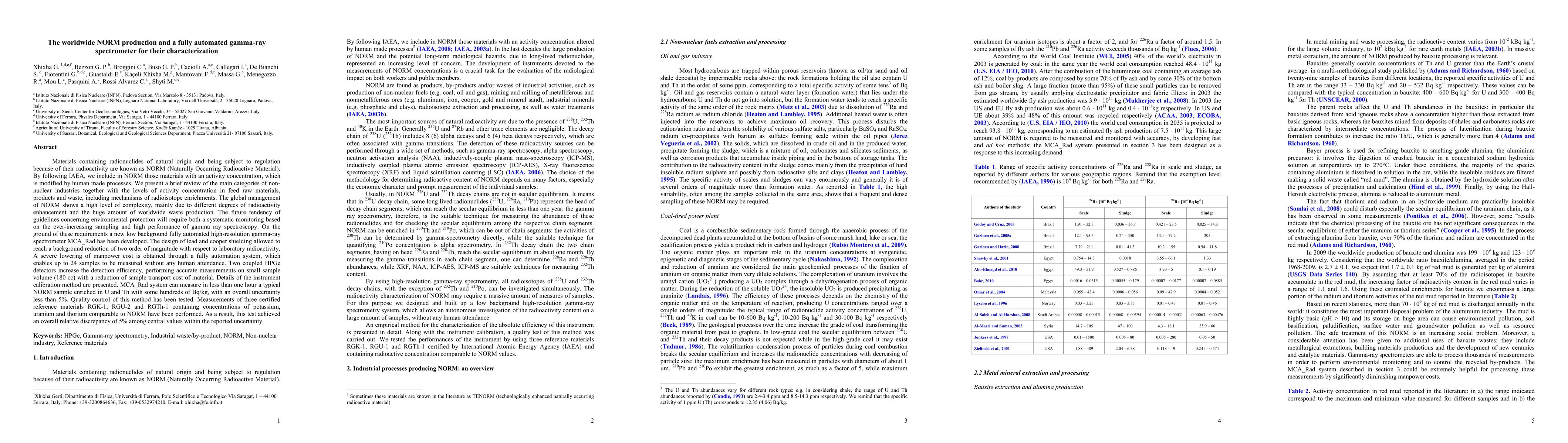 Materials containing radionuclides of natural origin, which is modified by human made processes and being subject to regulation because of their radioactivity are known as NORM. We present a brief review of the main categories of non-nuclear industries together with the levels of activity concentration in feed raw materials, products and waste, including mechanisms of radioisotope enrichments. The global management of NORM shows a high level of complexity, mainly due to different degrees of radioactivity enhancement and the huge amount of worldwide waste production. The future tendency of guidelines concerning environmental protection will require both a systematic monitoring based on the ever-increasing sampling and high performance of gamma ray spectroscopy. On the ground of these requirements a new low background fully automated high-resolution gamma-ray spectrometer MCA_Rad has been developed. The design of Pb and Cu shielding allowed to reach a background reduction of two order of magnitude with respect to laboratory radioactivity. A severe lowering of manpower cost is obtained through a fully automation system, which enables up to 24 samples to be measured without any human attendance. Two coupled HPGe detectors increase the detection efficiency, performing accurate measurements on sample volume (180 cc) with a reduction of sample transport cost of material. Details of the instrument calibration method are presented. MCA_Rad system can measure in less than one hour a typical NORM sample enriched in U and Th with some hundreds of Bq/kg, with an overall uncertainty less than 5%. Quality control of this method has been tested. Measurements of certified reference materials RGK-1, RGU-2 and RGTh-1 containing concentrations of K, U and Th comparable to NORM have been performed, resulting an overall relative discrepancy of 5% among central values within the reported uncertainty.