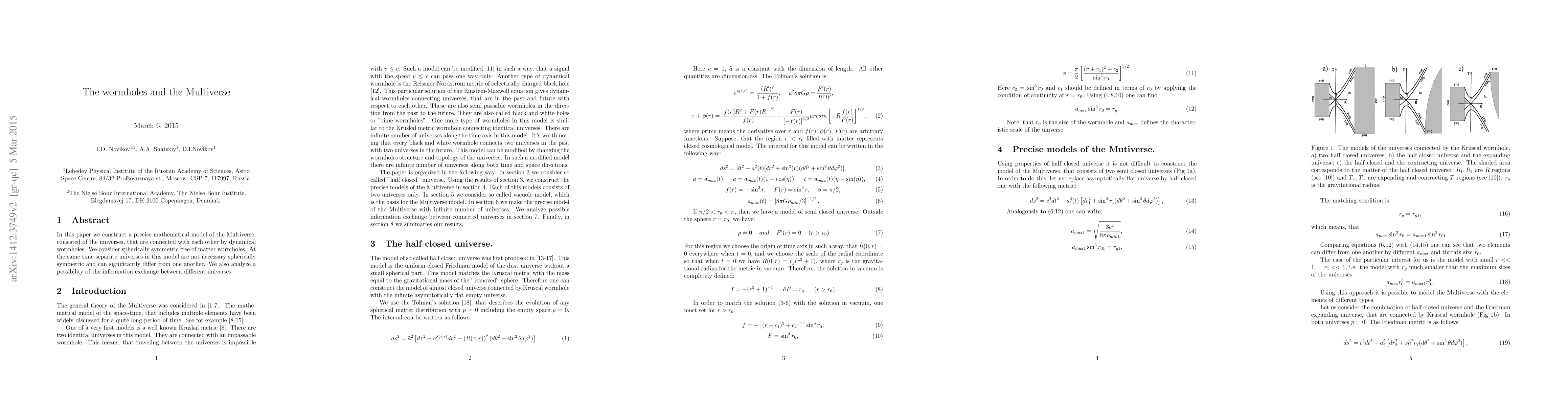 In this paper we construct a precise mathematical model of the Multiverse, consisted of the universes, that are connected with each other by dynamical wormholes. We consider spherically symmetric free of matter wormholes. At the same time separate universes in this model are not necessary spherically symmetric and can significantly differ from one another. We also analyze a possibility of the information exchange between different universes.