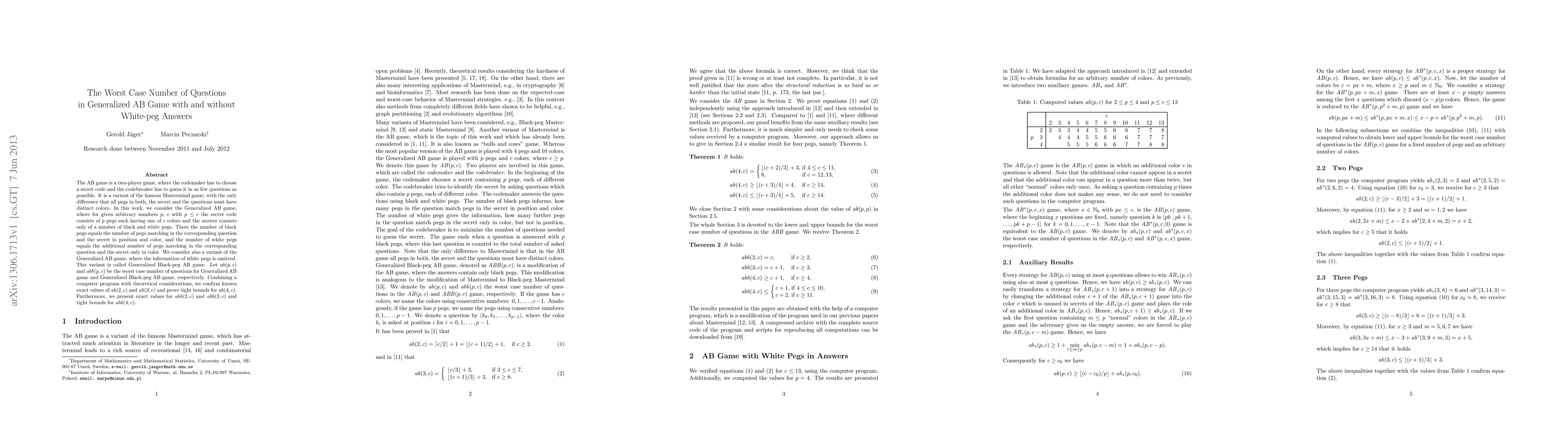 This research paper investigates the worst-case number of questions in generalized AB games with and without white-peg answers, providing exact values and tight bounds for various scenarios.