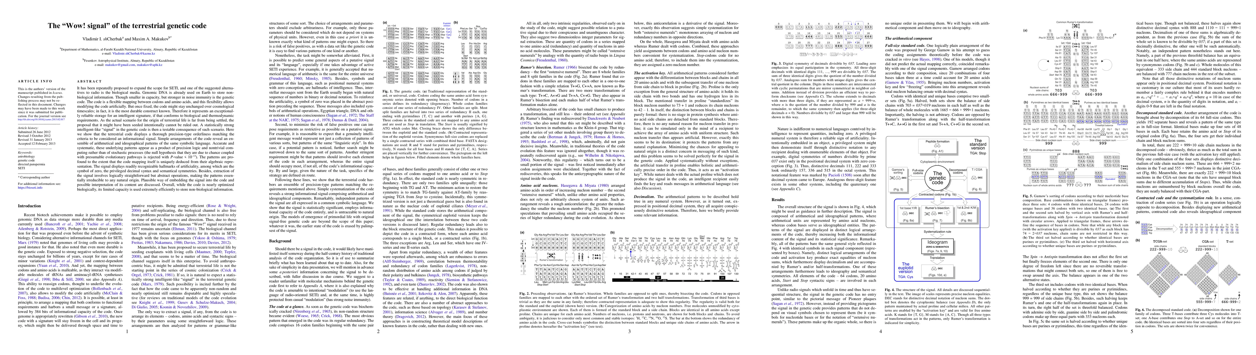 The genetic code displays precision orderliness matching criteria for an informational signal, with hallmarks of artificiality, making it a testable consequence of intentional seeding in the origin of life scenario.