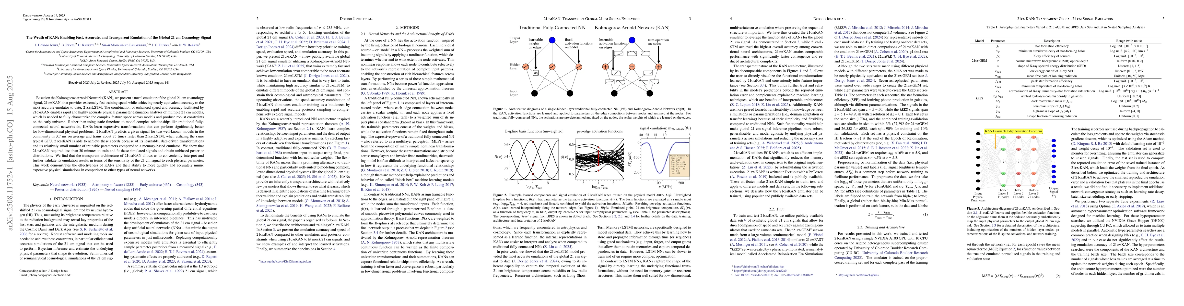 The research introduces '21cmKAN', a novel emulator for the global 21 cm cosmology signal using Kolmogorov-Arnold Network (KAN). It offers faster training speed and comparable accuracy to the existing '21cmLSTM' emulator. '21cmKAN' predicts signals in milliseconds, trains 75 times faster, and requires less time to fit simulated signals. Its transparent architecture aids in interpreting results, demonstrating KANs' effectiveness in mimicking complex simulations swiftly and accurately.