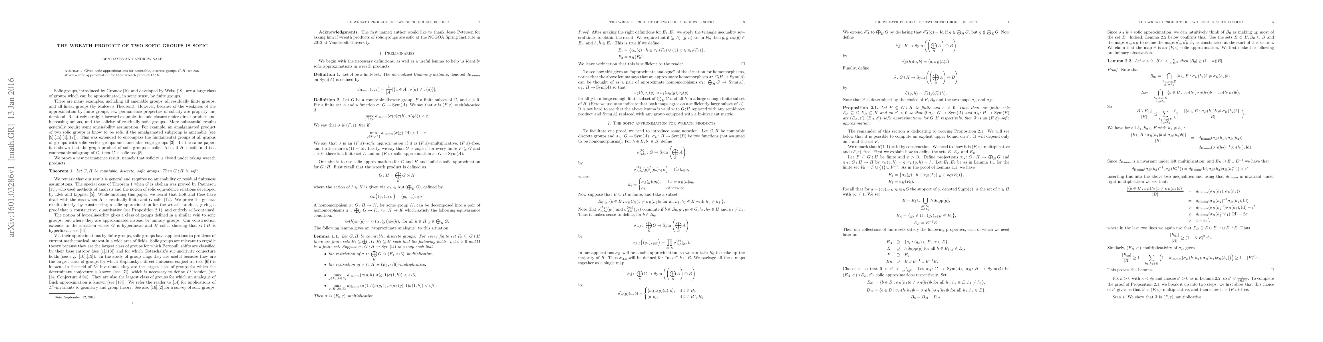 Summary: The paper demonstrates how to construct a sofic approximation for the wreath product of two sofic groups $G$ and $H$, given their respective sofic approximations. This extends the concept of soficity to more complex group structures.