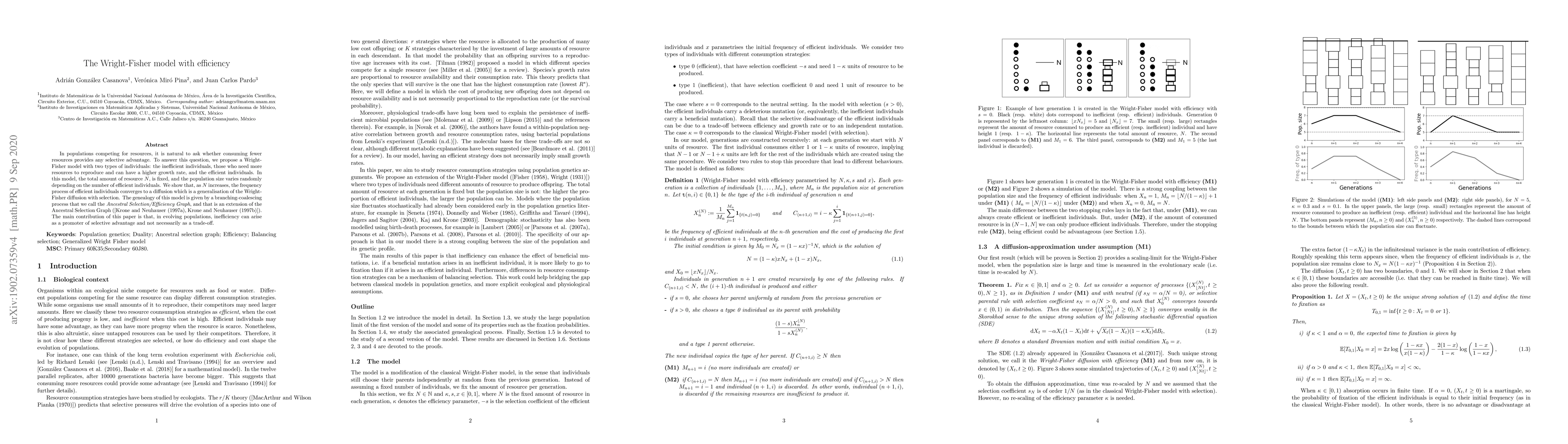 This paper proposes a Wright-Fisher model distinguishing between inefficient and efficient individuals in resource-competing populations. It demonstrates that, as resource availability increases, efficient individuals' frequency converges to a generalized diffusion process, suggesting that inefficiency can promote selective advantage rather than being a trade-off.