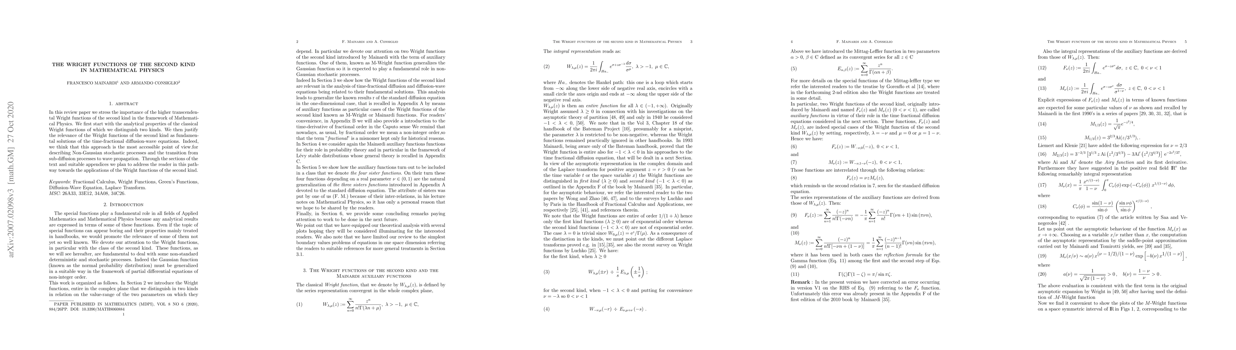 In this review paper we stress the importance of the higher transcendental Wright functions of the second kind in the framework of Mathematical Physics.We first start with the analytical properties of the classical Wright functions of which we distinguish two kinds. We then justify the relevance of the Wright functions of the second kind as fundamental solutions of the time-fractional diffusion-wave equations. Indeed, we think that this approach is the most accessible point of view for describing non-Gaussian stochastic processes and the transition from sub-diffusion processes to wave propagation. Through the sections of the text and suitable appendices we plan to address the reader in this pathway towards the applications of the Wright functions of the second kind. Keywords: Fractional Calculus, Wright Functions, Green's Functions, Diffusion-Wave Equation,