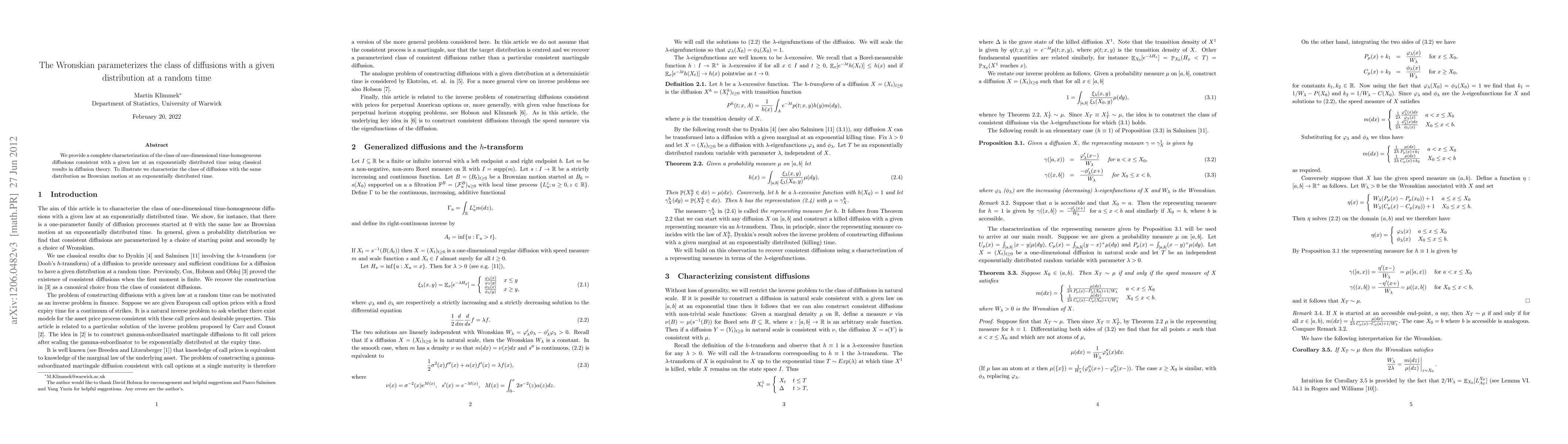 Summary: This paper characterizes the class of one-dimensional time-homogeneous diffusions that share a given distribution at an exponentially distributed time using the Wronskian, and exemplifies this with diffusions matching Brownian motion's distribution at such times.