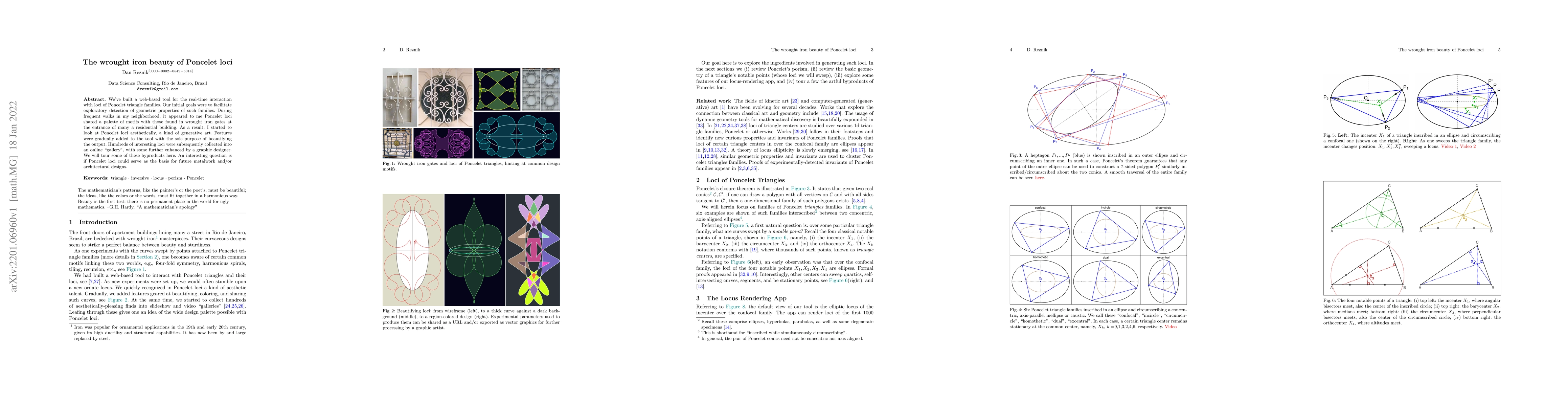 We've built a web-based tool for the real-time interaction with loci of Poncelet triangle families. Our initial goals were to facilitate exploratory detection of geometric properties of such families. During frequent walks in my neighborhood, it appeared to me Poncelet loci shared a palette of motifs with those found in wrought iron gates at the entrance of many a residential building. As a result, I started to look at Poncelet loci aesthetically, a kind of generative art. Features were gradually added to the tool with the sole purpose of beautifying the output. Hundreds of interesting loci were subsequently collected into an online "gallery", with some further enhanced by a graphic designer. We will tour some of these byproducts here. An interesting question is if Poncelet loci could serve as the basis for future metalwork and/or architectural designs.