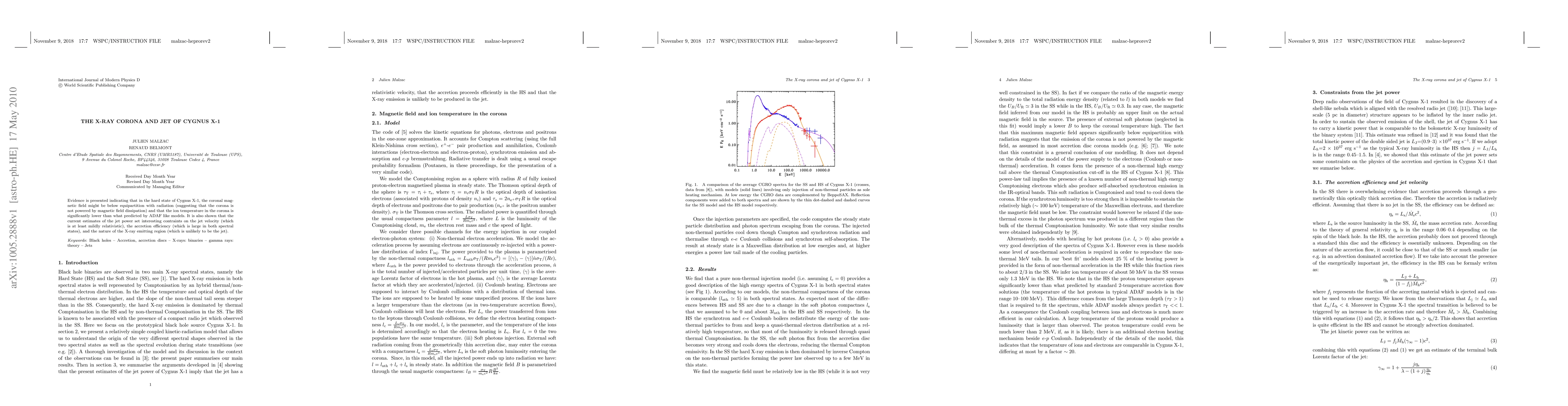 Evidence is presented indicating that in the hard state of Cygnus X-1, the coronal mag- netic field might be below equipartition with radiation (suggesting that the corona is not powered by magnetic field dissipation) and that the ion temperature in the corona is significantly lower than what predicted by ADAF like models. It is also shown that the current estimates of the jet power set interesting contraints on the jet velocity (which is at least mildly relativistic), the accretion efficiency (which is large in both spectral states), and the nature of the X-ray emitting region (which is unlikely to be the jet).