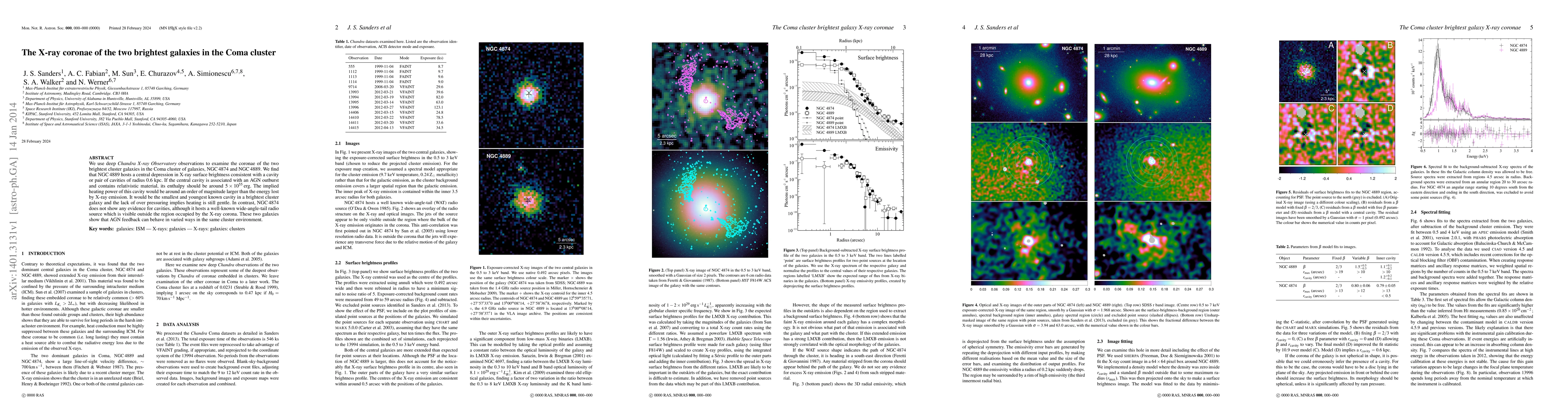 This study uses Chandra X-ray Observatory data to analyze the coronae of NGC 4889 and NGC 4874 in the Coma cluster, finding a central cavity in NGC 4889 suggesting AGN activity, while NGC 4874 lacks such cavities but hosts a wide-angle-tail radio source, indicating diverse AGN feedback mechanisms in the same cluster.