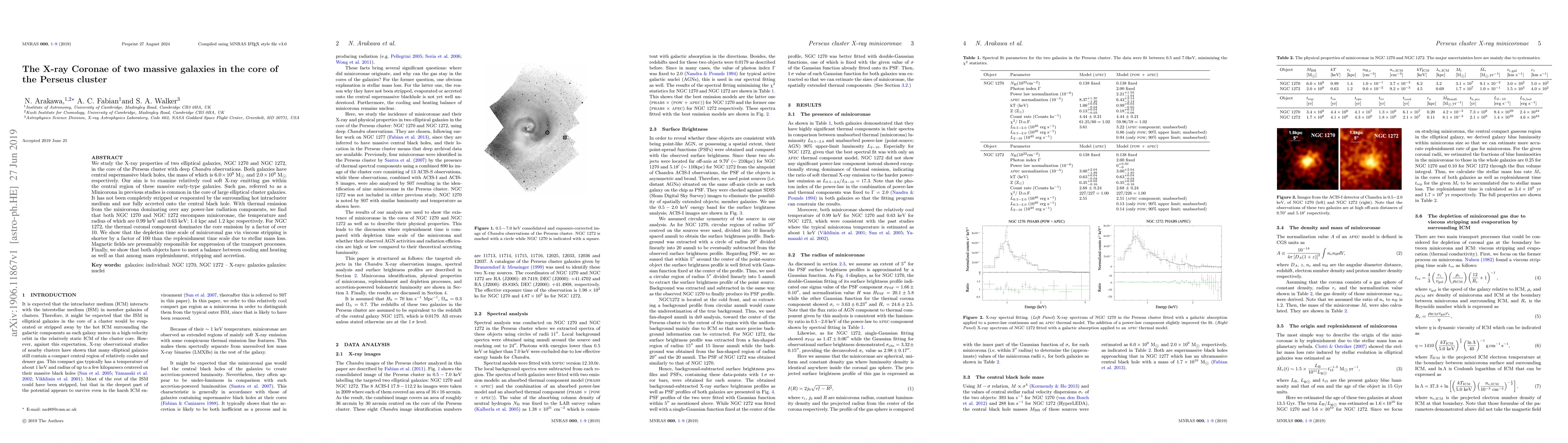 We study the X-ray properties of two elliptical galaxies, NGC 1270 and NGC 1272, in the core of the Perseus cluster with deep Chandra observations. Both galaxies have central supermassive black holes, the mass of which is $6.0 \times 10^{9}$ M$_{\odot}$ and $2.0 \times 10^{9}$ M$_{\odot}$ respectively. Our aim is to examine relatively cool soft X-ray emitting gas within the central region of these massive early-type galaxies. Such gas, referred to as a Minicorona in previous studies is common in the core of large elliptical cluster galaxies. It has not been completely stripped or evaporated by the surrounding hot intracluster medium and nor fully accreted onto the central black hole. With thermal emission from the minicorona dominating over any power-law radiation components, we find that both NGC 1270 and NGC 1272 encompass minicoronae, the temperature and radius of which are $0.99$ keV and $0.63$ keV; $1.4$ kpc and $1.2$ kpc respectively. For NGC 1272, the thermal coronal component dominates the core emission by a factor of over 10. We show that the depletion time scale of minicoronal gas via viscous stripping is shorter by a factor of $100$ than the replenishment time scale due to stellar mass loss. Magnetic fields are presumably responsible for suppression of the transport processes. Finally, we show that both objects have to meet a balance between cooling and heating as well as that among mass replenishment, stripping and accretion.
