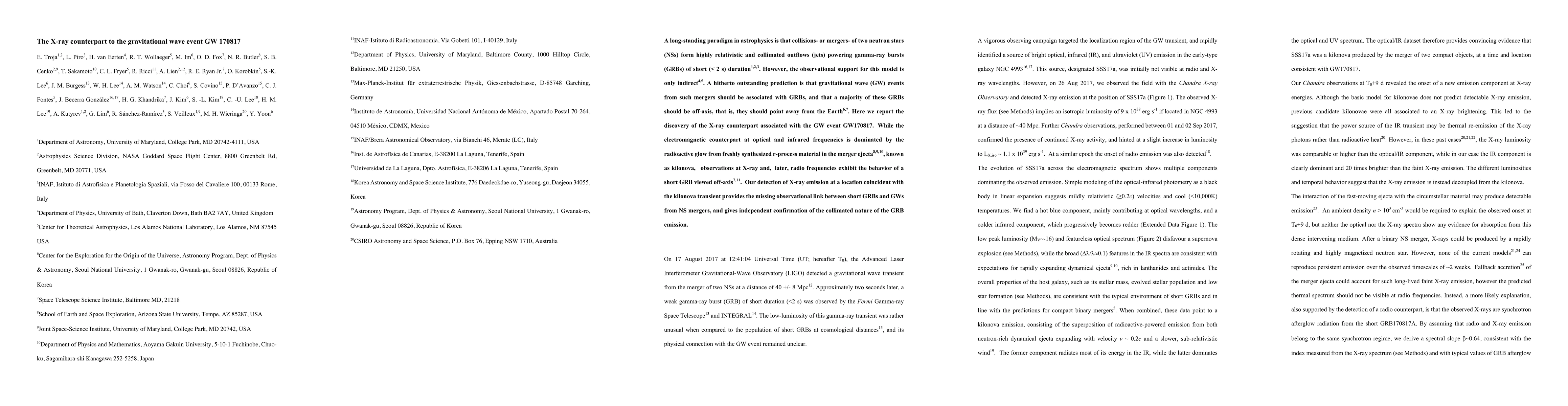 This paper reports the discovery of the X-ray counterpart to the gravitational wave event GW170817, confirming the association between neutron star mergers and short gamma-ray bursts, and providing evidence for the off-axis nature of the GRB emission. The X-ray emission observed coincides with the kilonova, supporting the model of relativistic jets from neutron star collisions.