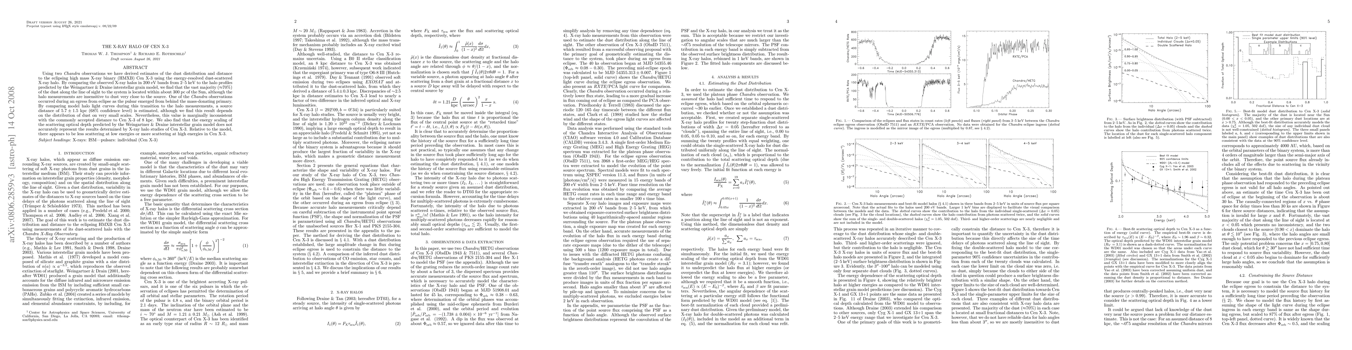 This study uses Chandra observations to estimate the dust distribution and distance to the HMXB Cen X-3, finding most dust within 300 pc of the Sun. A new distance estimate of 5.7 +/- 1.5 kpc is derived, conflicting with the accepted 8 kpc distance, and suggesting discrepancies in the energy scaling of scattering optical depth models.