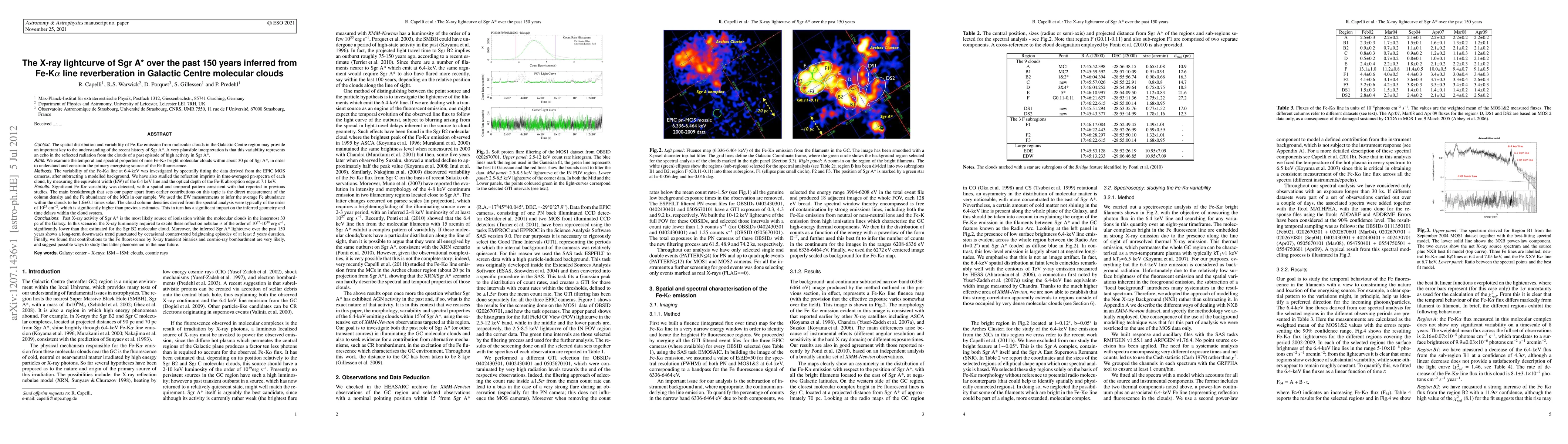 We examine the temporal and spectral properties of nine Fe-Ka bright molecular clouds within about 30 pc of Sgr A*, in order to understand and constrain the primary energising source of the Fe fluorescence. Significant Fe-Ka variability was detected, with a spatial and temporal pattern consistent with that reported in previous studies. The main breakthrough that sets our paper apart from earlier contributions on this topic is the direct measurement of the column density and the Fe abundance of the MCs in our sample. We used the EW measurements to infer the average Fe abundance within the clouds to be 1.6$\pm$0.1 times solar. The cloud column densities derived from the spectral analysis were typically of the order of 10$^{23}$ cm$^{-2}$, which is significantly higher than previous estimates. This in turn has a significant impact on the inferred geometry and time delays within the cloud system. Past X-ray activity of Sgr A* is the most likely source of ionisation within the molecular clouds in the innermost 30 pc of the Galaxy. In this scenario, the X-ray luminosity required to excite these reflection nebulae is of the order of 10$^{37}-10^{38}$ erg s$^{-1}$, significantly lower than that estimated for the Sgr B2 molecular cloud. Moreover, the inferred Sgr A* lightcurve over the past 150 years shows a long-term downwards trend punctuated by occasional counter-trend brightening episodes of at least 5 years duration. Finally, we found that contributions to the Fe fluorescence by X-ray transient binaries and cosmic-ray bombardment are very likely, and suggest possible ways to study this latter phenomenon in the near future.