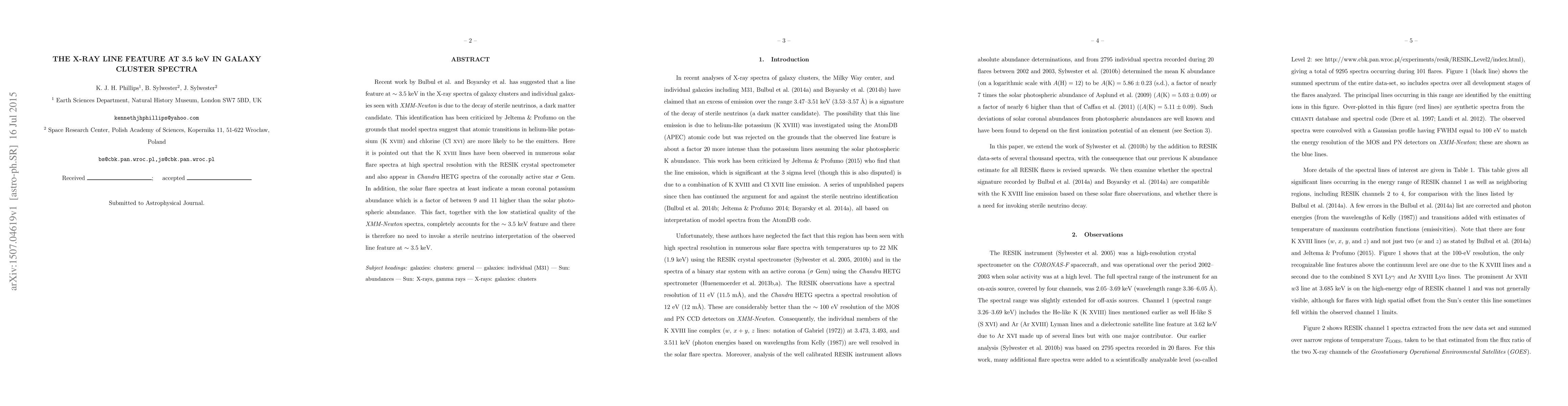 Recent work by Bulbul et al. and Boyarsky et al. has suggested that a line feature at approx. 3.5 keV in the X-ray spectra of galaxy clusters and individual galaxies seen with XMM-Newton is due to the decay of sterile neutrinos, a dark matter candidate. This identification has been criticized by Jeltema and Profumo on the grounds that model spectra suggest that atomic transitions in helium-like potassium (K XVIII) and chlorine (Cl XVI) are more likely to be the emitters. Here it is pointed out that the K XVIII lines have been observed in numerous solar flare spectra at high spectral resolution with the RESIK crystal spectrometer and also appear in Chandra HETG spectra of the coronally active star sigma Gem. In addition, the solar flare spectra at least indicate a mean coronal potassium abundance which is a factor of between 9 and 11 higher than the solar photospheric abundance. This fact, together with the low statistical quality of the XMM-Newton spectra, completely accounts for the approx. 3.5 keV feature and there is therefore no need to invoke a sterile neutrino interpretation of the observed line feature at 3.5 keV.