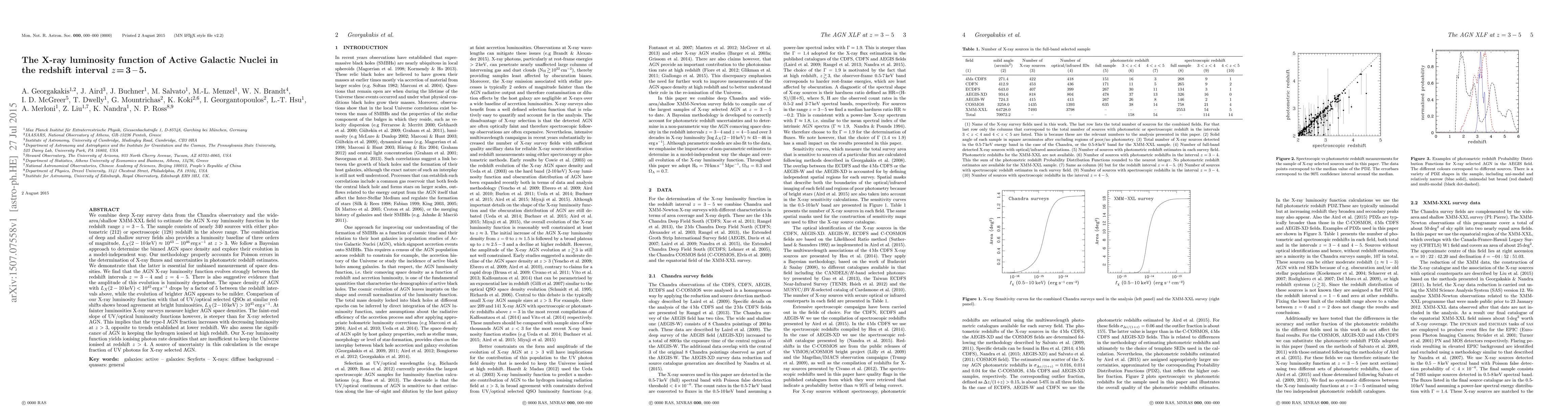 This paper estimates the X-ray luminosity function of Active Galactic Nuclei (AGN) at redshifts z=3-5 using combined data from Chandra and XMM-XXL surveys. The study finds strong evolution in AGN luminosity function between z=3-4 and z=4-5, with brighter AGN showing milder evolution. The paper also notes that the type-I AGN fraction increases at lower luminosities at high redshifts, contrary to lower redshift trends.