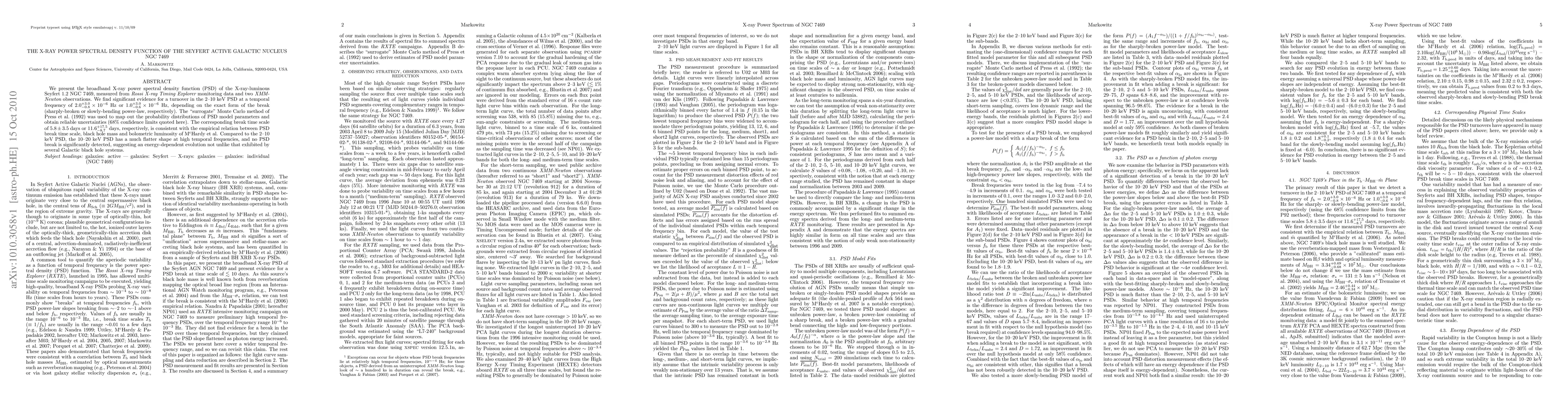 We present the broadband X-ray power spectral density function (PSD) of the X-ray-luminous Seyfert 1.2 NGC 7469, measured from Rossi X-ray Timing Explorer monitoring data and two XMM-Newton observations. We find significant evidence for a turnover in the 2-10 keV PSD at a temporal frequency of 2.0(+3.0,-0.8)e-6 Hz or 1.0(+3.0,-0.6)e-6 Hz, depending on the exact form of the break (sharply-broken or slowly-bending power-law, respectively). The ``surrogate'' Monte Carlo method of Press et al. (1992) was used to map out the probability distributions of PSD model parameters and obtain reliable uncertainties (68 per cent confidence limits quoted here). The corresponding break time scale of 5.8 (+/- 3.5) days or 11.6(+17.5,-8.7) days, respectively, is consistent with the empirical relation between PSD break time scale, black hole mass and bolometric luminosity of McHardy et al. Compared to the 2-10 keV PSD, the 10-20 keV PSD has a much flatter shape at high temporal frequencies, and no PSD break is significantly detected, suggesting an energy-dependent evolution not unlike that exhibited by several Galactic black hole systems.