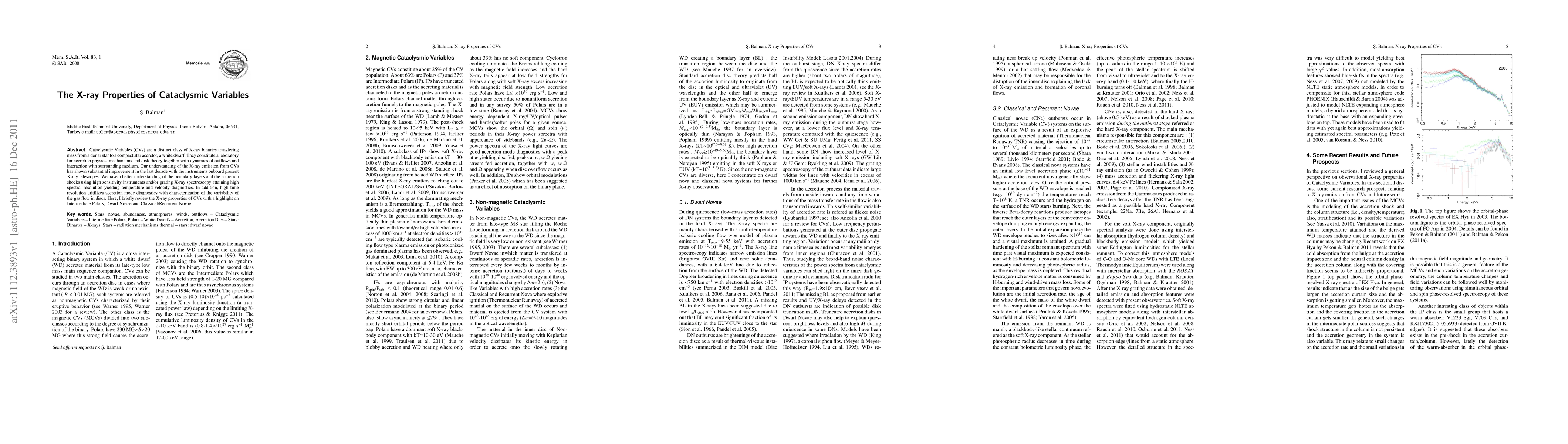This paper reviews the X-ray properties of Cataclysmic Variables (CVs), focusing on their accretion mechanisms and dynamics, and highlights advancements in understanding their X-ray emissions through improved telescope instruments and high-resolution spectroscopy. It emphasizes the study of Intermediate Polars, Dwarf Novae, and Classical/Recurrent Novae.