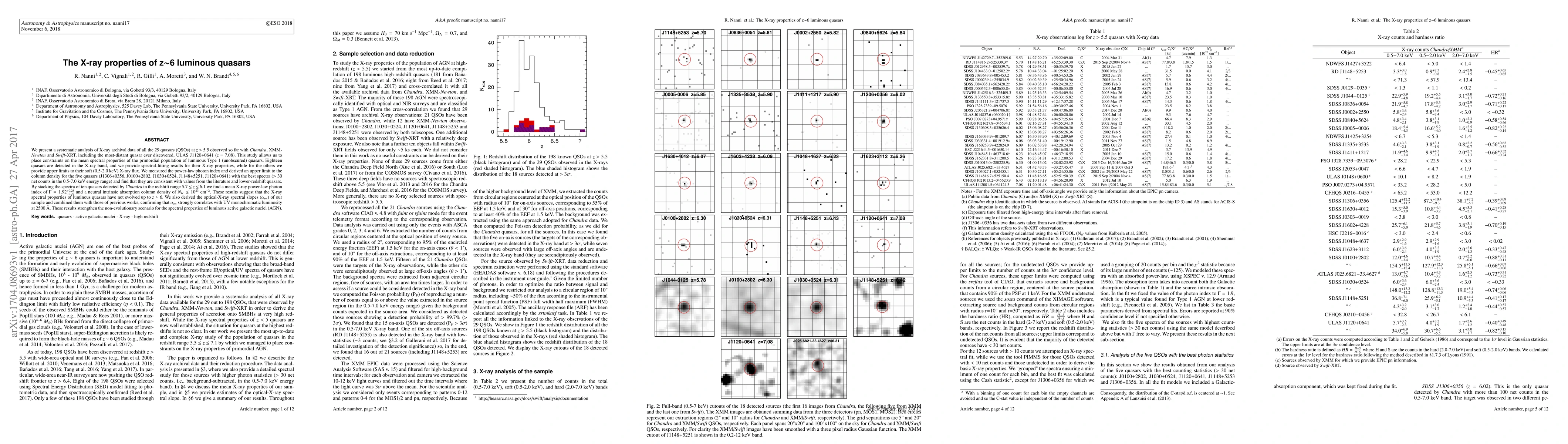 This study analyzes X-ray data from 29 high-redshift quasars ($z > 5.5$), finding that 18 are detected in X-rays, while the others provide upper limits. The research concludes that luminous quasars' X-ray spectral properties remain consistent up to $z \approx 6$, supporting a non-evolutionary model for active galactic nuclei.