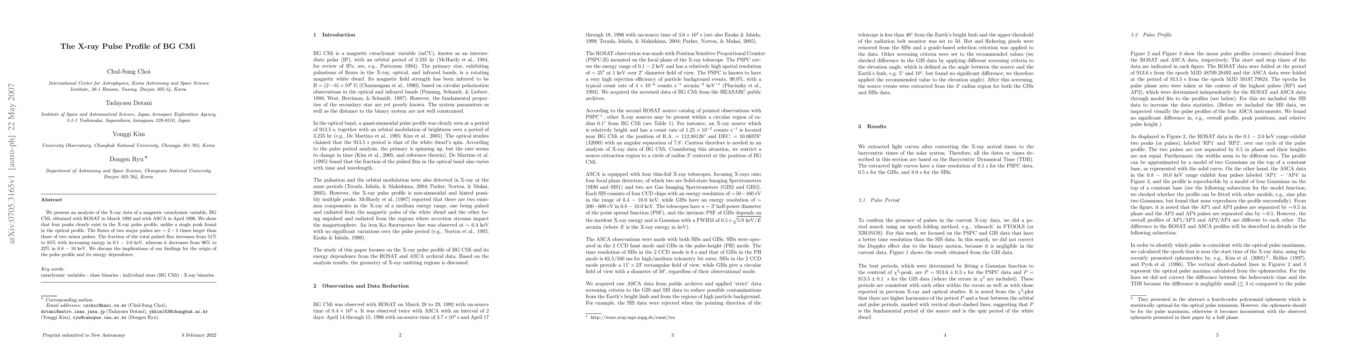 This study analyzes X-ray data from the magnetic cataclysmic variable BG CMi, revealing four distinct peaks in the X-ray pulse profile, contrasting with the single peak in the optical profile. The major pulses exhibit significantly higher flux compared to minor pulses, and the pulsed flux fraction varies with energy, suggesting complex underlying physical processes.