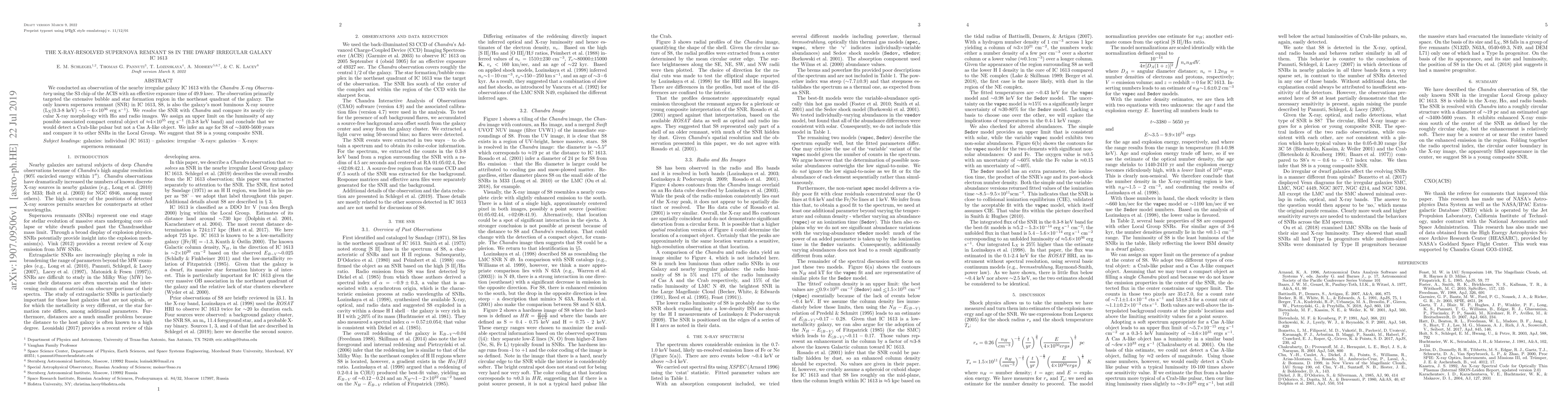 We conducted an observation of the nearby irregular galaxy IC 1613 with the Chandra X-ray Observatory using the S3 chip of the ACIS with an effective exposure time of 49.9 ksec. The observation primarily targeted the extensive bubble and star formation region in the northeast quadrant of the galaxy. The only known supernova remnant (SNR) in IC 1613, S8, is also the galaxy's most luminous X-ray source (L_X (0.3-8 keV) ~5-6x10^{36} erg/s). We resolve the SNR with Chandra and compare its nearly circular X-ray morphology with Halpha and radio images. We assign an upper limit on the luminosity of any possible associated compact central object of ~4x10^{35}$ erg/s (0.3-8 keV band) and conclude that we would detect a Crab-like pulsar but not a Cas A-like object. We infer an age for S8 of ~3400-5600 years and compare it to other SNRs in the Local Group. We suggest that S8 is a young composite SNR.