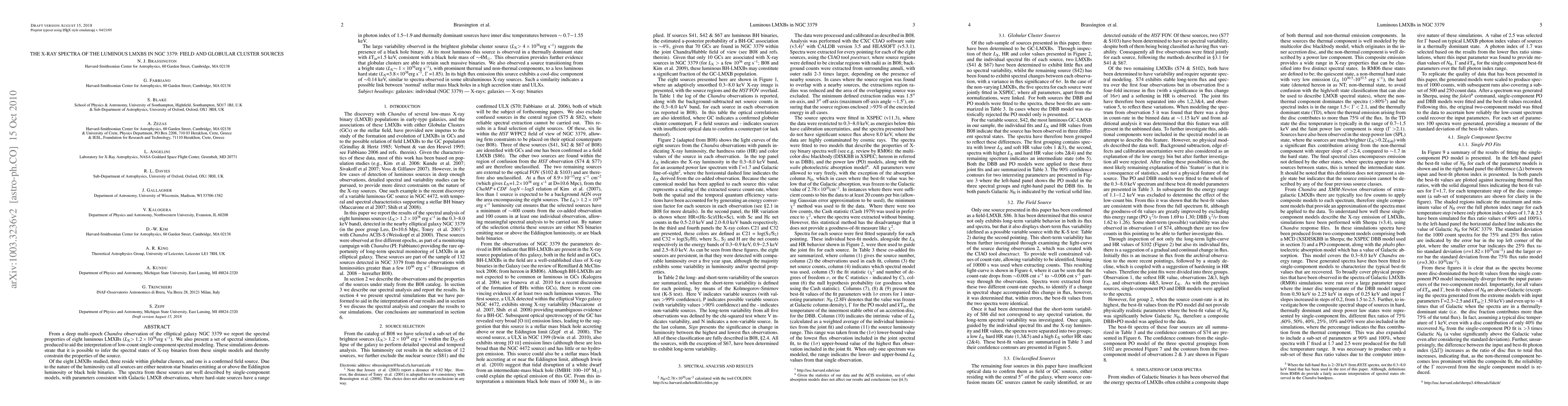 From a deep multi-epoch Chandra observation of the elliptical galaxy NGC 3379 we report the spectral properties of eight luminous LMXBs (LX>1.2E38 erg/s). We also present a set of spectral simulations, produced to aid the interpretation of low-count single-component spectral modeling. These simulations demonstrate that it is possible to infer the spectral states of X-ray binaries from these simple models and thereby constrain the properties of the source. Of the eight LMXBs studied, three reside within globular clusters, and one is a confirmed field source. Due to the nature of the luminosity cut all sources are either neutron star binaries emitting at or above the Eddington luminosity or black hole binaries. The spectra from these sources are well described by single-component models, with parameters consistent with Galactic LMXB observations, where hard-state sources have a range in photon index of 1.5-1.9 and thermally dominated sources have inner disc temperatures between ~0.7-1.55 keV. The large variability observed in the brightest globular cluster source (LX>4E38 erg/s) suggests the presence of a black hole binary. At its most luminous this source is observed in a thermally dominated state with kT=1.5 keV, consistent with a black hole mass of ~4 Msol. This observation provides further evidence that globular clusters are able to retain such massive binaries. We also observed a source transitioning from a bright state (LX~1E39 erg/s), with prominent thermal and non-thermal components, to a less luminous hard state (LX=3.8E38 erg/s, Gamma=1.85). In its high flux emission this source exhibits a cool-disc component of ~0.14 keV, similar to spectra observed in some ultraluminous X-ray sources. Such a similarity indicates a possible link between `normal' stellar mass black holes in a high accretion state and ULXs.