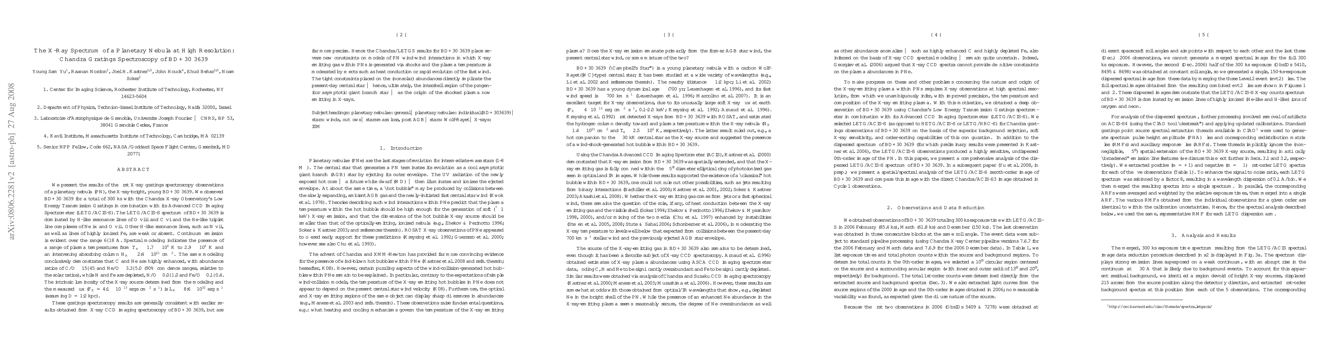 This paper reports high-resolution X-ray spectroscopy of the planetary nebula BD+30 3639 using Chandra's gratings, revealing enhanced C and Ne abundances and depleted N and Fe, suggesting the central star's influence on the nebula's shocked plasma. The study finds plasma temperatures ranging from 1.7x10^6 K to 2.9x10^6 K and an intrinsic luminosity of L_X~8.6x10^32 erg s-1.