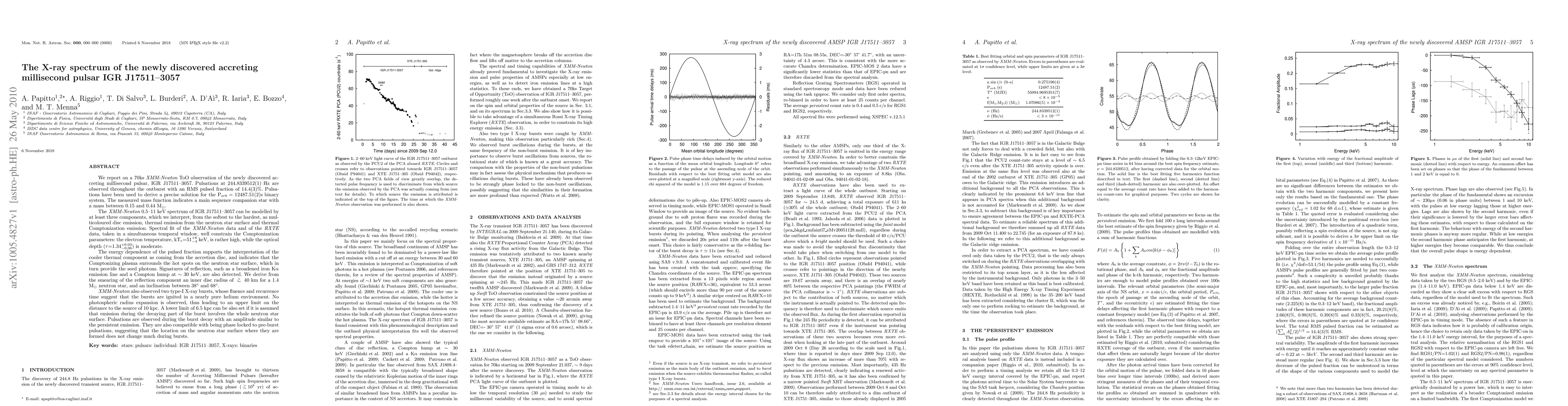 We report on an XMM-Newton observation of the accreting millisecond pulsar, IGR J17511-3057. Pulsations at 244.8339512(1) Hz are observed with an RMS pulsed fraction of 14.4(3)%. A precise solution for the P_orb=12487.51(2)s binary system is derived. The measured mass function indicates a main sequence companion with a mass between 0.15 and 0.44 Msun. The XMM-Newton spectrum of the source can be modelled by at least three components, multicoloured disc emission, thermal emission from the NS surface and thermal Comptonization emission. Spectral fit of the XMM-Newton data and of the RXTE data, taken in a simultaneous temporal window, constrain the Comptonization parameters: the electron temperature, kT_e=51(+6,-4) keV, is rather high, while the optical depth (tau=1.34(+0.03,-0.06)) is moderate. The energy dependence of the pulsed fraction supports the interpretation of the cooler thermal component as coming from the accretion disc, and indicates that the Comptonizing plasma surrounds the hot spots on the NS surface, which provide the seed photons. Signatures of reflection, such as a broadened iron K-alpha emission line and a Compton hump at 30 keV ca., are also detected. We derive from the smearing of the reflection component an inner disc radius of ~> 40 km for a 1.4 Msun neutron star, and an inclination between 38{\deg} and 68{\deg}. XMM-Newton also observed two type-I X-ray bursts, probably ignited in a nearly pure helium environment. No photospheric radius expansion is observed, thus leading to an upper limit on the distance to the source of 10 kpc. A lower limit of 6.5 kpc can be also set if it is assumed that emission during the decaying part of the burst involves the whole neutron star surface. Pulsations observed during the burst decay are compatible with being phase locked, and have a similar amplitude, than pre-burst pulsations.