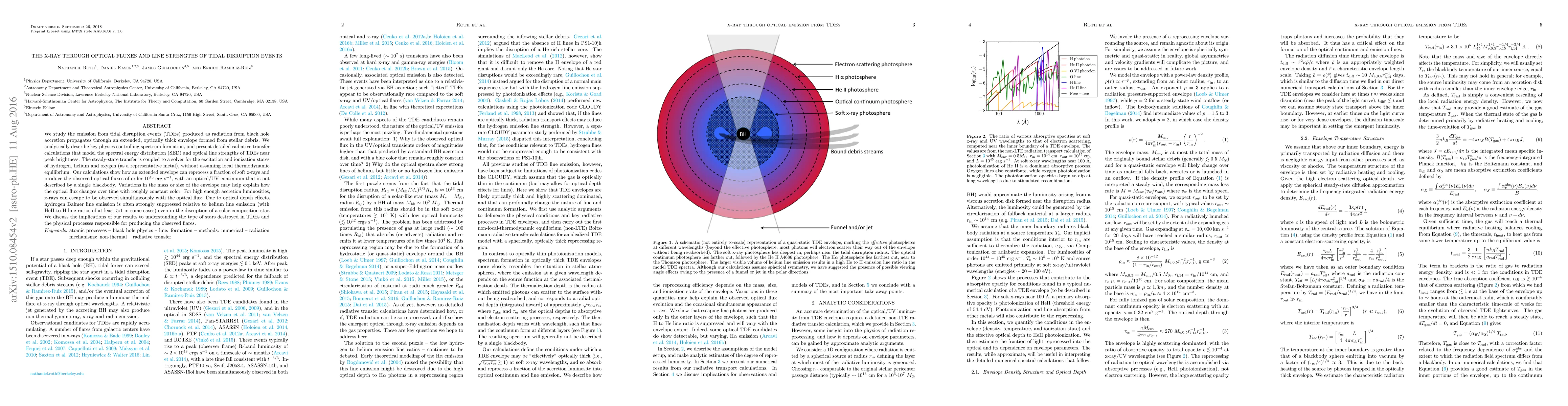 Observations of luminous flares resulting from the possible tidal disruption of stars by supermassive black holes have raised a number of puzzles. Outstanding questions include the origin of the optical and ultraviolet (UV) flux, the weakness of hydrogen lines in the spectrum, and the occasional simultaneous observation of x-rays. Here we study the emission from tidal disruption events (TDEs) produced as radiation from black hole accretion propagates through an extended, optically thick envelope formed from stellar debris. We analytically describe key physics controlling spectrum formation, and present detailed radiative transfer calculations that model the spectral energy distribution (SED) and optical line strengths of TDEs near peak brightness. The steady-state transfer is coupled to a non local thermodynamic equilibrium treatment of the excitation and ionization states of hydrogen, helium and oxygen (as a representative metal). Our calculations show how an extended envelope can reprocess a fraction of soft x-rays and produce the observed optical fluxes of order 10^43 ergs per second. Variations in the mass or size of the envelope may help explain how the optical flux changes over time with roughly constant color. For high enough accretion luminosities, x-rays can highly ionize the reprocessing region and escape to be observed simultaneously with the optical flux, producing an SED not described by a single blackbody. Due to optical depth effects, hydrogen Balmer line emission is often strongly suppressed relative to helium line emission (with HeII-to-H line ratios of at least 5:1 in some cases) even in the disruption of a solar-composition star. We discuss the implications of our results to understanding the type of stars destroyed in TDEs and the physical processes responsible for producing the observed flares.