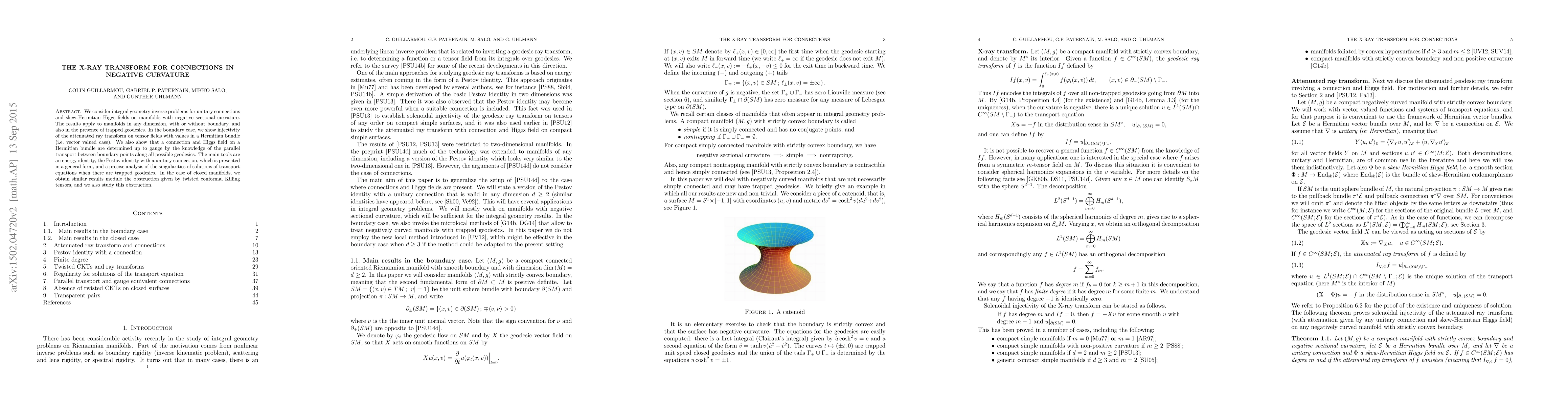 We consider integral geometry inverse problems for unitary connections and skew-Hermitian Higgs fields on manifolds with negative sectional curvature. The results apply to manifolds in any dimension, with or without boundary, and also in the presence of trapped geodesics. In the boundary case, we show injectivity of the attenuated ray transform on tensor fields with values in a Hermitian bundle (i.e. vector valued case). We also show that a connection and Higgs field on a Hermitian bundle are determined up to gauge by the knowledge of the parallel transport between boundary points along all possible geodesics. The main tools are an energy identity, the Pestov identity with a unitary connection, which is presented in a general form, and a precise analysis of the singularities of solutions of transport equations when there are trapped geodesics. In the case of closed manifolds, we obtain similar results modulo the obstruction given by twisted conformal Killing tensors, and we also study this obstruction.