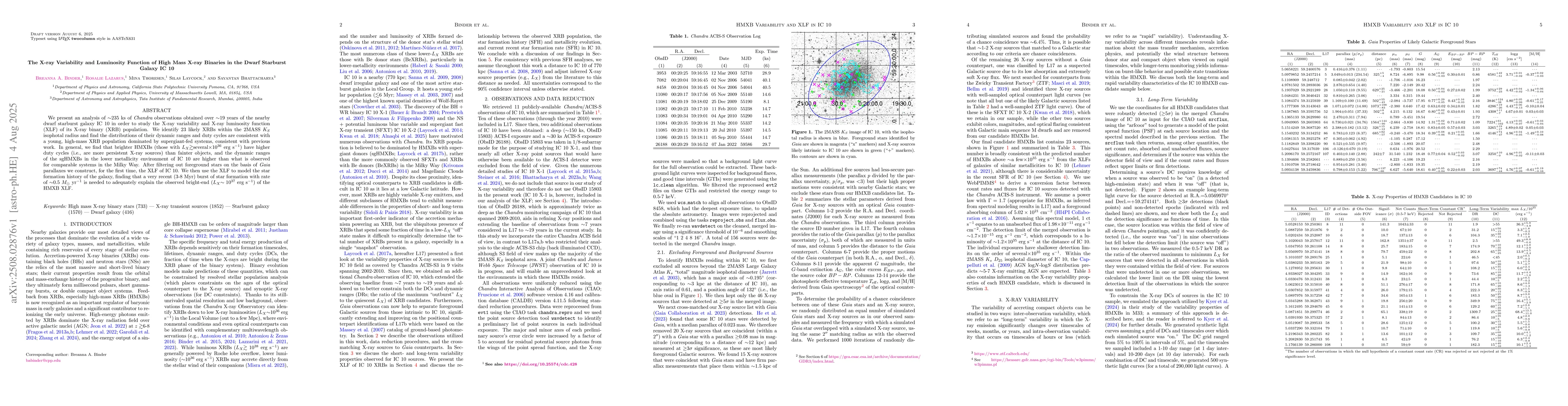 We present an analysis of $\sim$235 ks of Chandra observations obtained over $\sim$19 years of the nearby dwarf starburst galaxy IC 10 in order to study the X-ray variability and X-ray luminosity function (XLF) of its X-ray binary (XRB) population. We identify 23 likely XRBs within the 2MASS $K_S$ isophotal radius and find the distributions of their dynamic ranges and duty cycles are consistent with a young, high-mass XRB population dominated by supergiant (sg)-fed systems, consistent with previous work. In general, we find that brighter HMXBs (those with $L_X\gtrsim$several$\times10^{36}$ erg s$^{-1}$) have higher duty cycles (i.e., are more persistent X-ray sources) than fainter objects, and the dynamic ranges of the sgHMXBs in the lower metallicity environment of IC 10 are higher than what is observed for comparable systems in the Milky Way. After filtering out foreground stars on the basis of Gaia parallaxes we construct, for the first time, the XLF of IC 10. We then use the XLF to model the star formation history of the galaxy, finding that a very recent (3-8 Myr) burst of star formation with rate of $\sim$0.5 $M_{\odot}$ yr$^{-1}$ is needed to adequately explain the observed bright-end ($L_X\sim10^{37}$ erg s$^{-1}$) of the HMXB XLF.