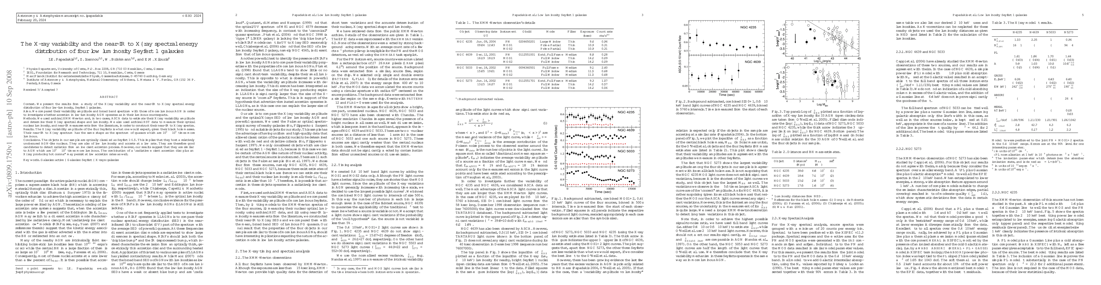 We present the results from a study of the X-ray variability and the near-IR to X-ray spectral energy distribution of four low-luminosity, Seyfert 1 galaxies. We compared their variability amplitude and broad band spectrum with those of more luminous AGN in order to investigate whether accretion in low-luminosity AGN operates as in their luminous counterparts. We used archival XMM-Newton and, in two cases, ASCA data to estimate their X-ray variability amplitude and determine their X-ray spectral shape and luminosity. We also used archival HST data to measure their optical nuclear luminosity, and near-IR measurements from the literature, in order to construct their near-IR to X-ray spectra. The X-ray variability amplitude of the four Seyferts is what one would expect, given their black hole masses. Their near-IR to X-ray spectrum has the same shape as the spectrum of quasars which are 10^2-10^5 times more luminous. The objects in our sample are optically classified as Seyfert 1-1.5. This implies that they host a relatively unobscured AGN-like nucleus. They are also of low luminosity and accrete at a low rate. They are therefore good candidates to detect radiation from an inefficient accretion process. However, our results suggest that they are similar to AGN which are 10^2-10^5 times more luminous. The combination of a "radiative efficient accretion disc plus an X-ray producing hot corona" may persist at low accretion rates as well.
