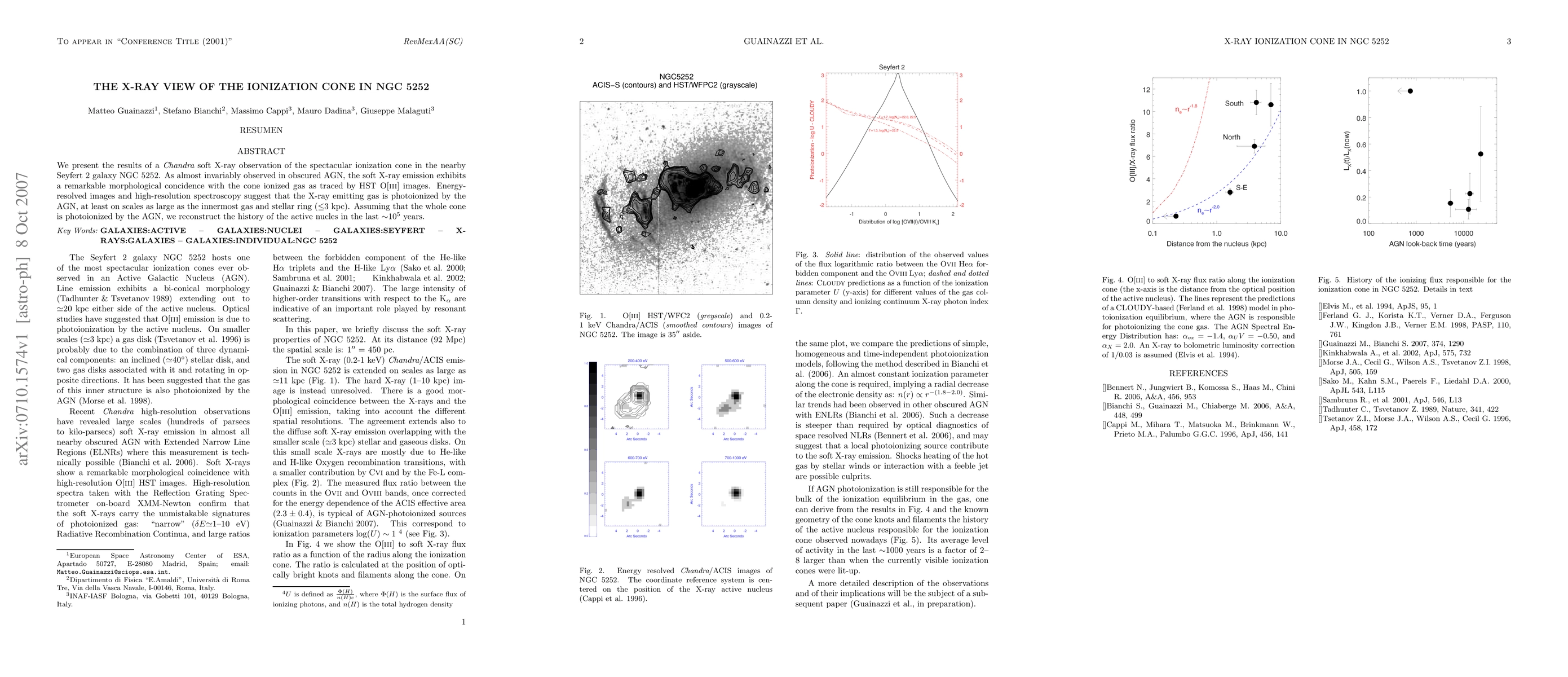 We present the results of a Chandra soft X-ray observation of the spectacular ionization cone in the nearby Seyfert 2 galaxy NGC 5252. As almost invariably observed in obscured AGN, the soft X-ray emission exhibits a remarkable morphological concidence with the cone ionized gas as traced by HST O[III] images. Energy-resolved images and high-resolution spectroscopy suggest that the X-ray emitting gas is photoionized by the AGN, at least on scales as large as the innermost gas and stellar ring (<3 kpc). Assuming that the whole cone is photoionized by the AGN, we reconstruct the history of the active nucles in the last 100000 years.