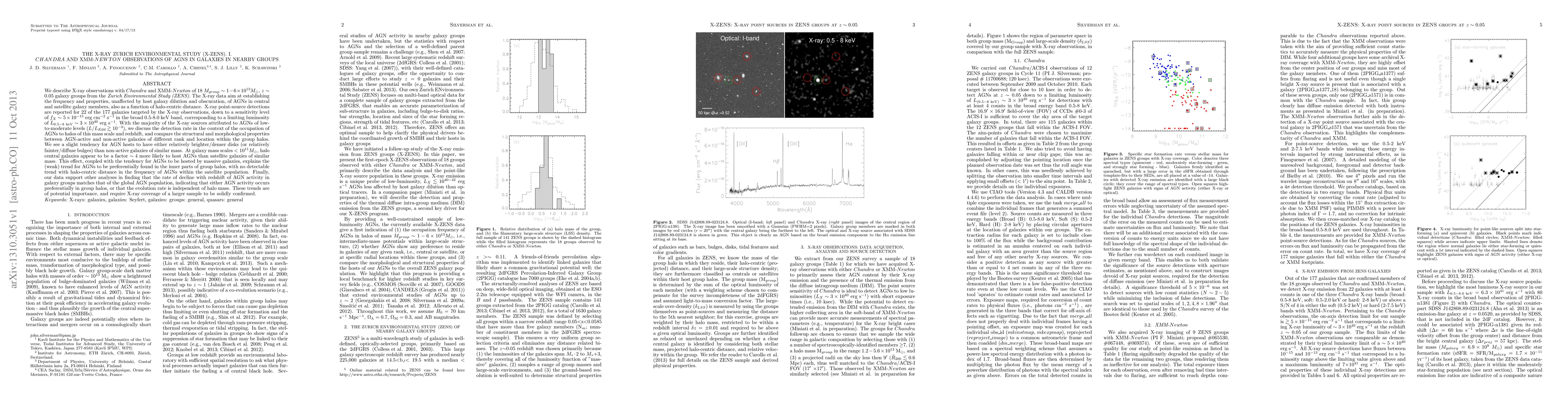 We describe X-ray observations with Chandra and XMM-Newton of 18 galaxy groups (M_group ~ 1-6x10^13 Msolar, z~0.05) from the Zurich Environmental Study (ZENS). We aim to establish the frequency and properties, unaffected by host galaxy dilution and obscuration, of AGNs in central and satellite galaxy members, also as a function of halo-centric distance. X-ray point-source detections are reported for 22 of 177 observed galaxies, down to a limit of f_(0.5-8 keV) ~ 5x10^-15 erg cm^-2 s^-1, corresponding to a limiting luminosity of L_(0.5-8 keV)~3x10^40 erg s^-1. With the majority of the X-ray sources attributed to AGNs of low-to-moderate levels (L/L_Edd>~10^-4), we discuss the detection rate in the context of the occupation of AGNs to halos of this mass scale and redshift, and compare the structural/morphological properties between AGN-active and non-active galaxies of different rank and location within the group halos. We see a slight tendency for AGN hosts to have either relatively brighter/denser disks (or relatively fainter/diffuse bulges) than non-active galaxies of similar mass. At galaxy mass scales <10^11 Msolar, central galaxies appear to be a factor ~4 more likely to host AGNs than satellite galaxies of similar mass. This effect, coupled with the tendency for AGNs to reside in massive galaxies, explains the (weak) trend for AGNs to be preferentially found in the inner regions of groups, with no detectable trend with halo-centric distance in the frequency of AGNs within the satellite population. Finally, our data support other analyses in finding that the rate of decline with redshift of AGN activity in groups matches that of the global AGN population, indicating that either AGNs occur preferentially in groups, or that the evolution rate is independent of halo mass. These trends are of potential importance, and require X-ray coverage of a larger sample to be solidly confirmed.