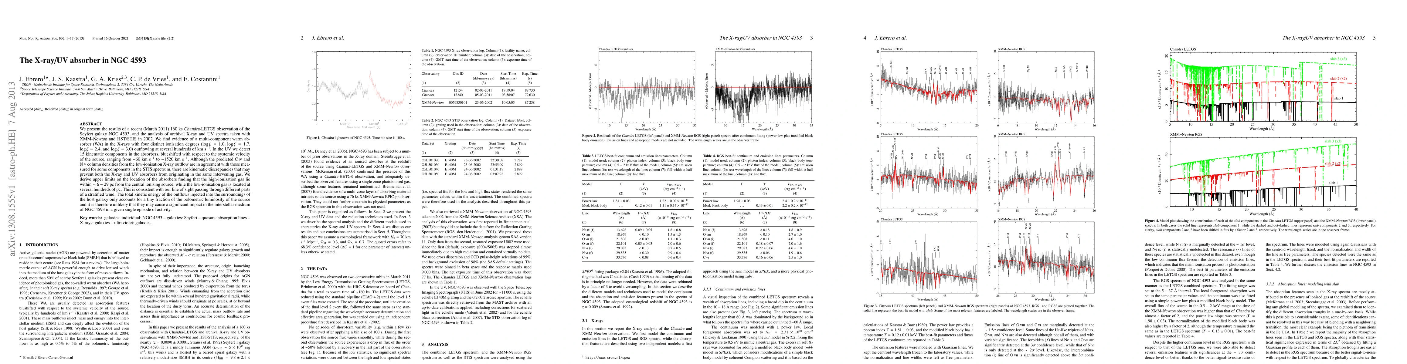We present the results of a recent (March 2011) 160 ks Chandra-LETGS observation of the Seyfert galaxy NGC 4593, and the analysis of archival X-ray and UV spectra taken with XMM-Newton and HST/STIS in 2002. We find evidence of a multi-component warm absorber (WA) in the X-rays with four distinct ionisation degrees (log xi = 1.0, log xi = 1.7, log xi = 2.4, and log xi = 3.0) outflowing at several hundreds of km/s. In the UV we detect 15 kinematic components in the absorbers, blueshifted with respect to the systemic velocity of the source, ranging from -60 km/s to -1520 km/s. Although the predicted CIV and NV column densities from the low-ionisation X-ray outflow are in agreement with those measured for some components in the STIS spectrum, there are kinematic discrepancies that may prevent both the X-ray and UV absorbers from originating in the same intervening gas. We derive upper limits on the location of the absorbers finding that the high-ionisation gas lie within ~6 - 29 pc from the central ionising source, while the low-ionisation gas is located at several hundreds of pc. This is consistent with our line of sight passing through different parts of a stratified wind. The total kinetic energy of the outflows injected into the surroundings of the host galaxy only accounts for a tiny fraction of the bolometric luminosity of the source, and it is therefore unlikely that they may cause a significant impact in the interstellar medium of NGC 4593 in a given single episode of activity.