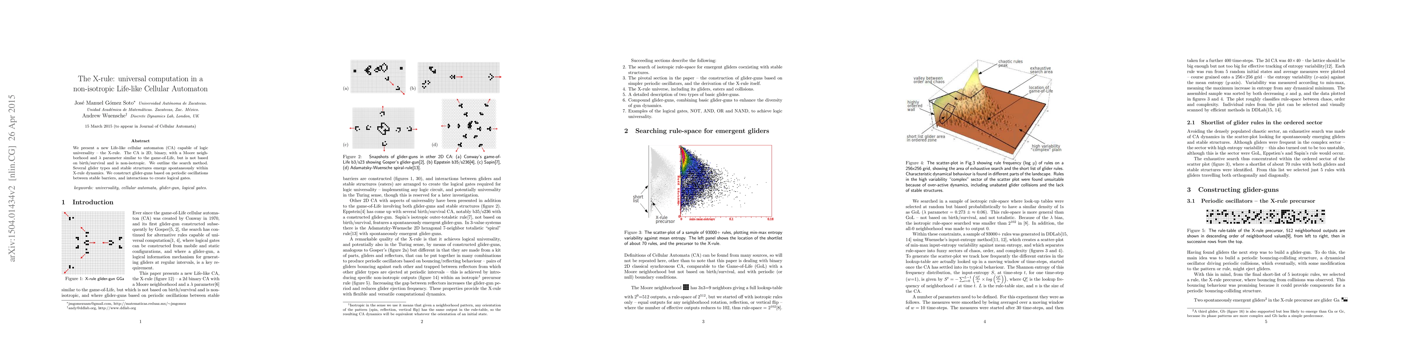 This paper introduces the X-rule, a novel 2D binary Life-like cellular automaton with logic universality, featuring non-isotropic dynamics and spontaneous emergence of gliders. The authors construct glider-guns and logical gates using periodic oscillations and interactions.